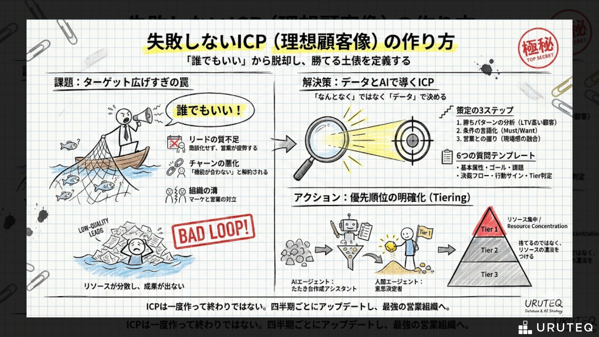 こうした対話を通じて、データの客観性と現場の肌感覚を融合させたものが、本当に使えるICPになります。