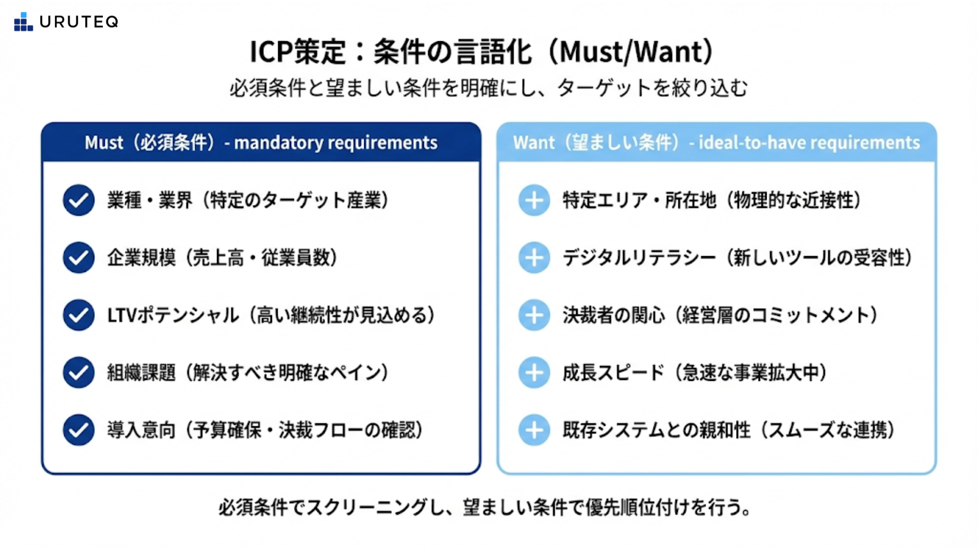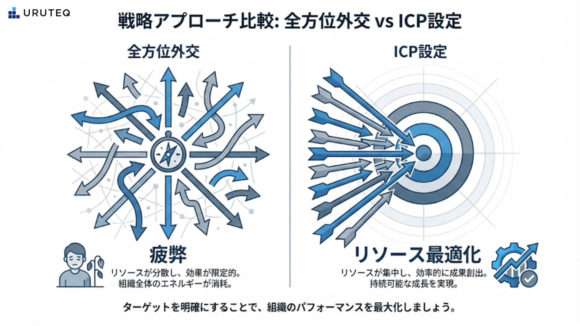 ICPを策定する最大のメリットは、この「リソースの最適化」と、組織全体が「追うべき顧客」と「追わなくていい顧客」の共通認識を持てることにあります。