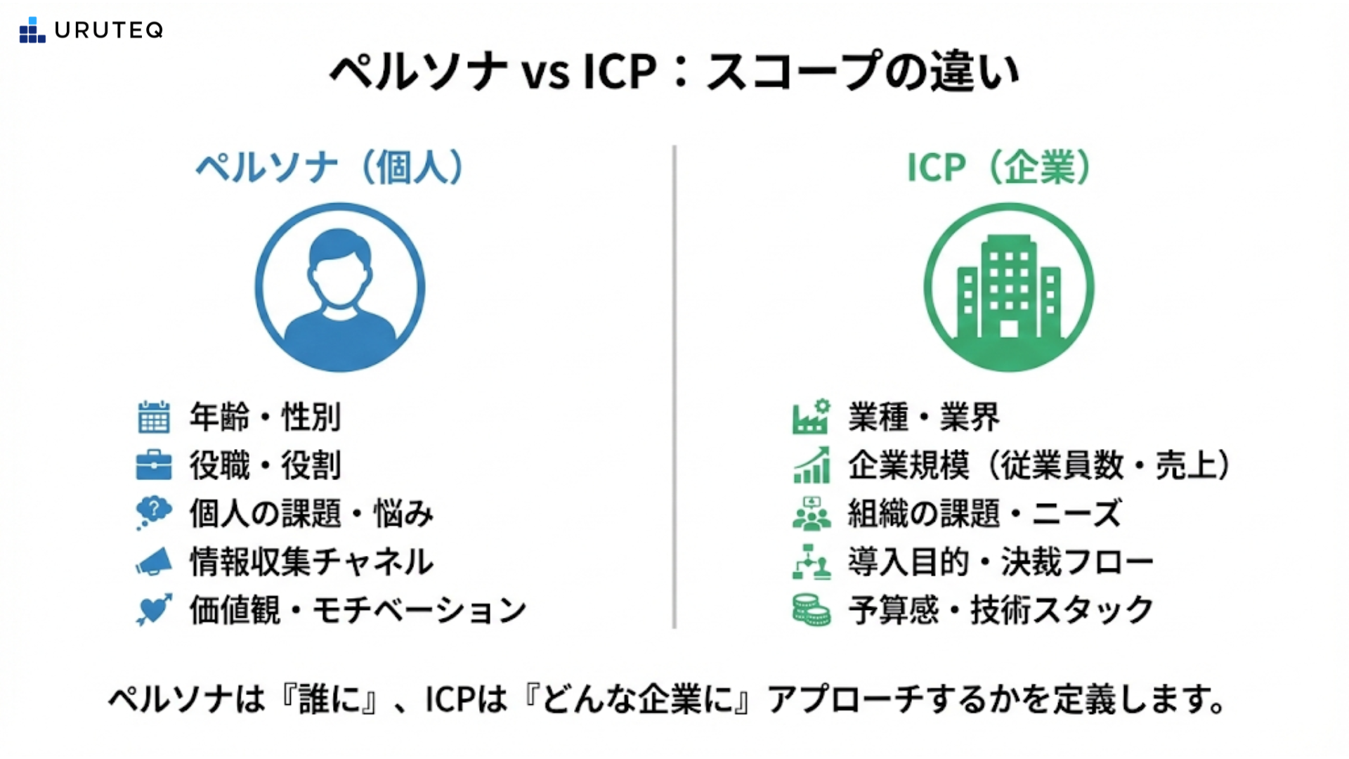 ペルソナは「担当者個人」の人格や抱える課題にフォーカスしたものです。対してICPは「企業(組織)」そのものの条件定義です。業種、売上規模、従業員数、導入しているテクノロジー、成長フェーズなど、企業としての属性を指します。