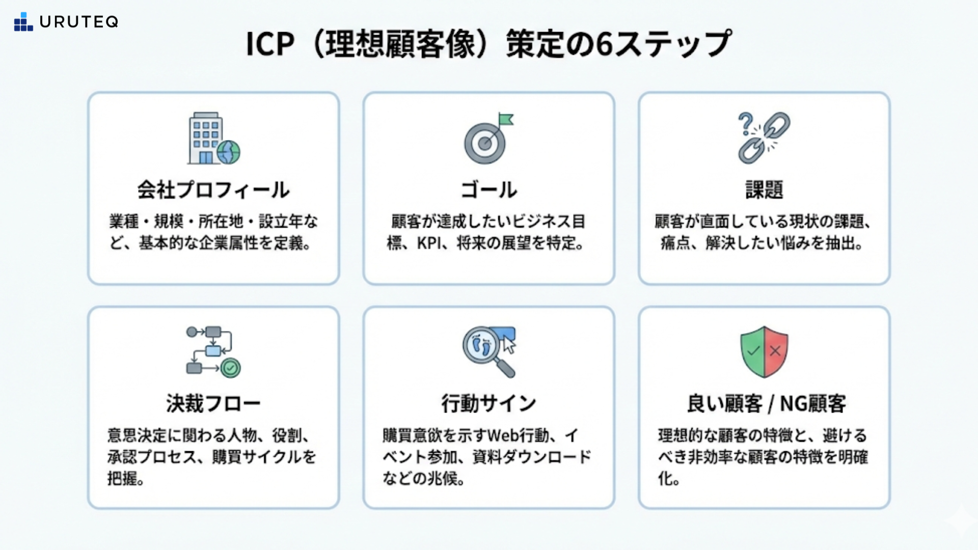 BtoBマーケティング、特にABM(アカウントベースドマーケティング)においては、個人のペルソナ設定の前に、まず「どの企業を攻めるか」というICPの定義が不可欠です。