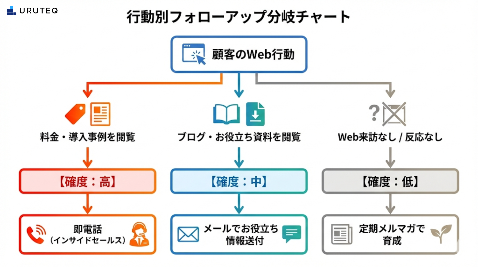 データが取れるようになっただけでは、売上は上がりません。重要なのは、そのデータを元に「いつ」「誰が」「何をするか」というアクションに落とし込むことです。ここでは、Web行動データに応じてフォローの内容を変えるセグメンテーションの具体例と、すぐに使えるアプローチのテンプレートを紹介します。