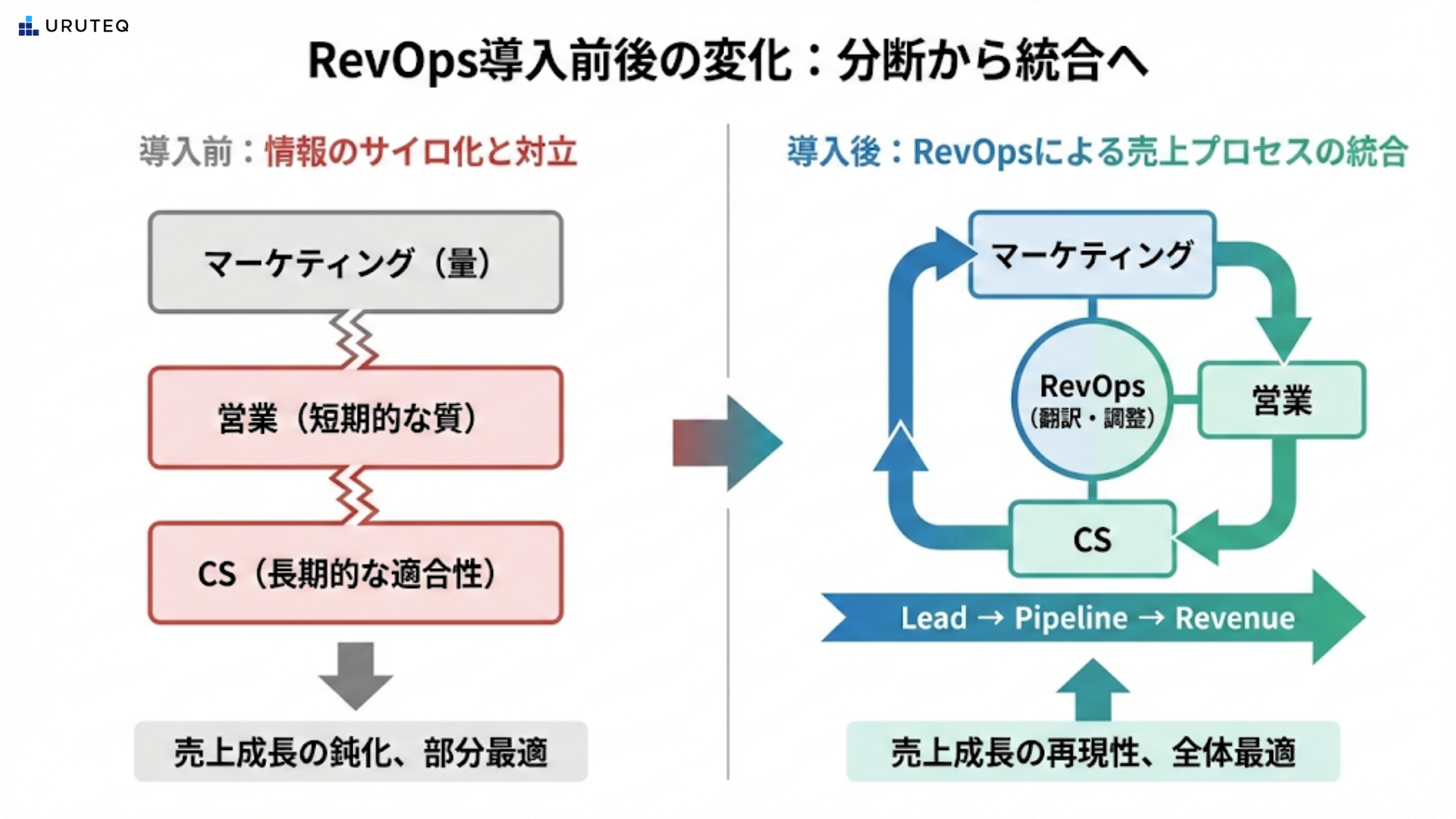RevOpsは、マーケティングと営業とカスタマーサクセスの間に立つ、単なる調整役や便利屋ではありません。その本質は、組織の売上生成メカニズムを、