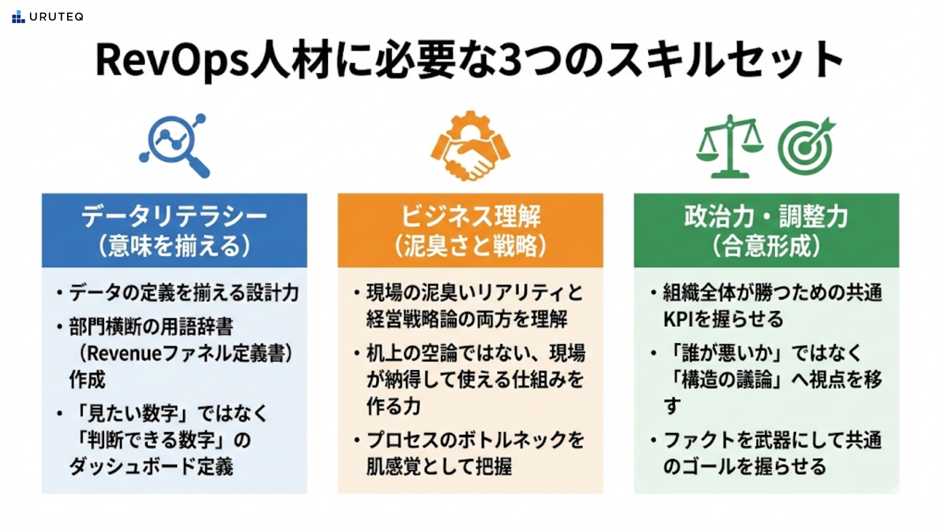 RevOpsという職種は新しいため、明確な定義が定まっていないことも多いですが、成果物から逆算すると必要なスキルセットが見えてきます。「何ができる人か」という観点で、大きく3つの要素に分解できます。