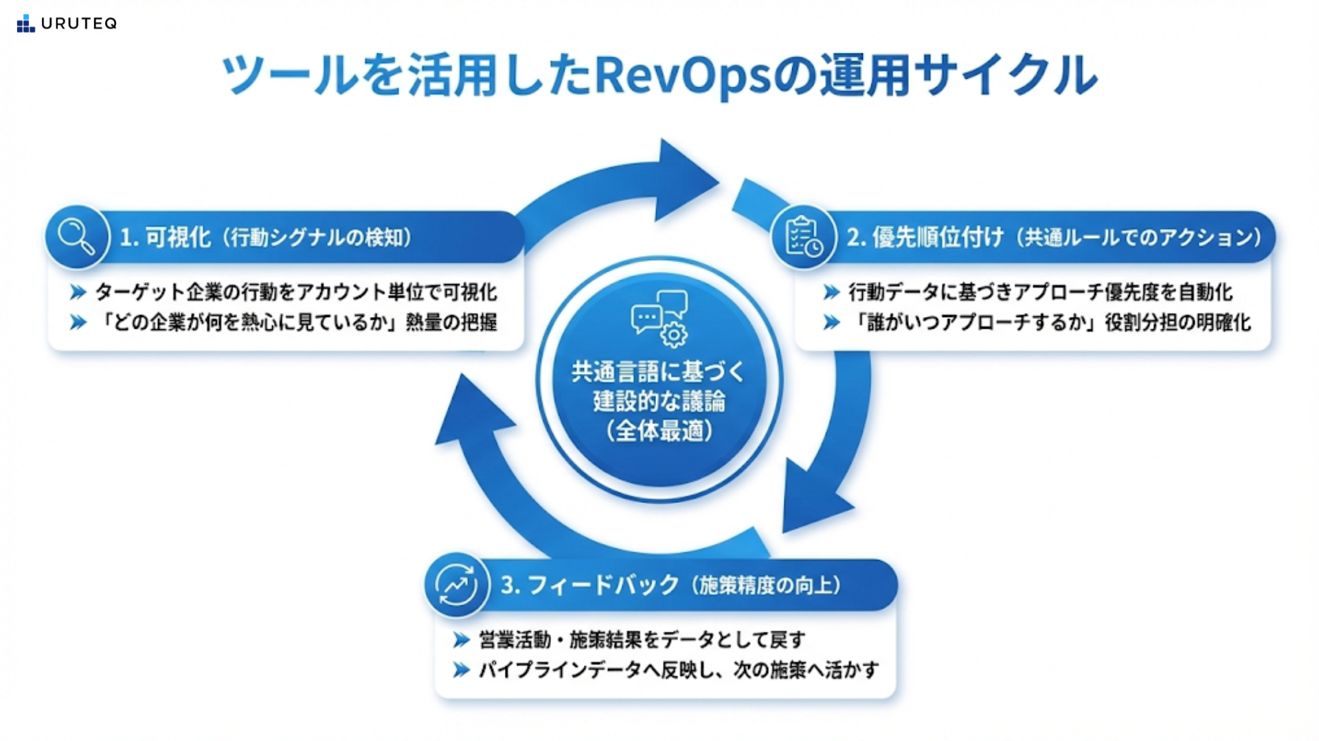 RevOpsの導入は、現場から情報を吸い上げるだけでなく、現場に「勝ちやすさ」や「時間の余裕」を還元するサイクルを作ることで初めて定着します。