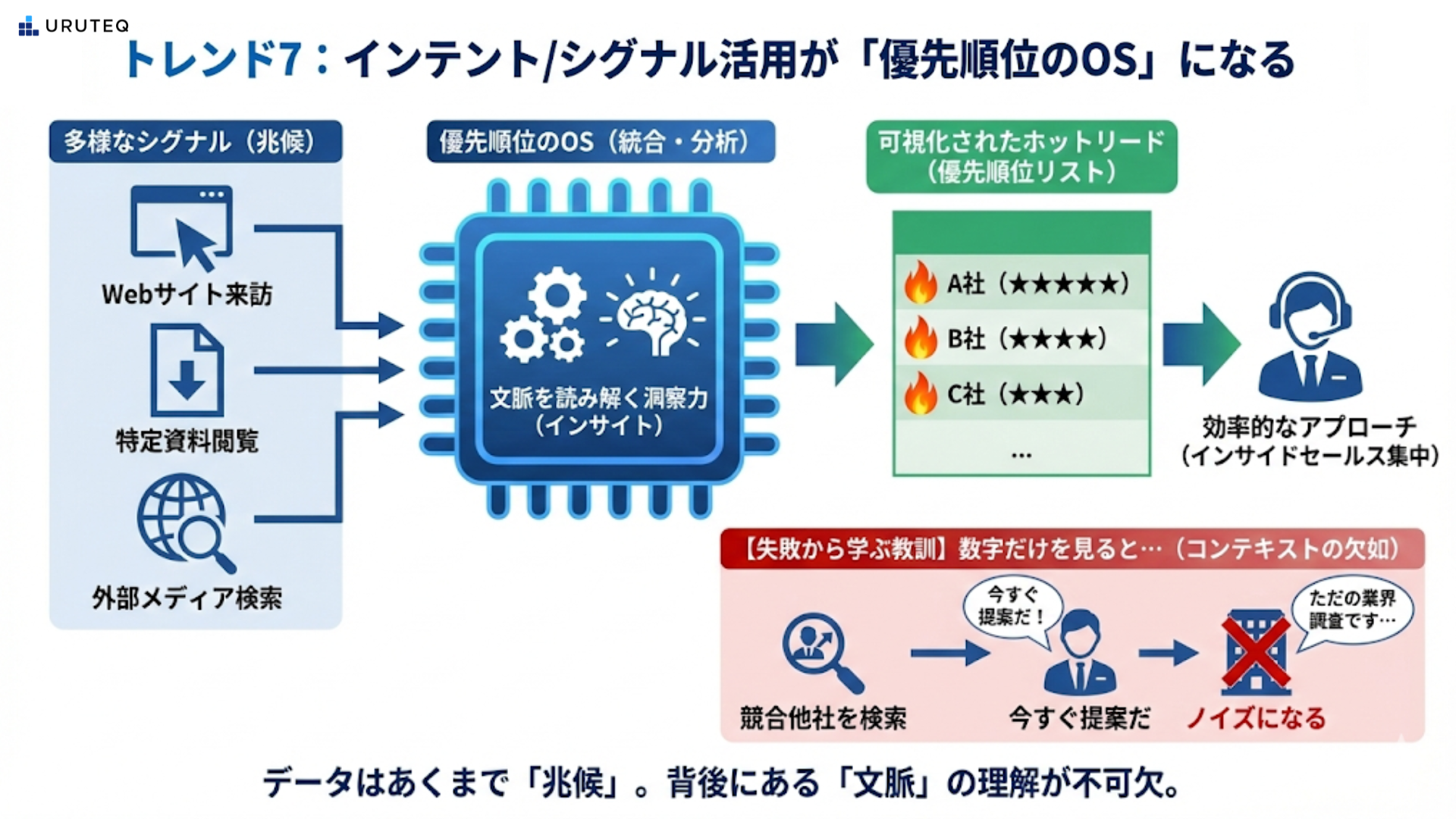 「誰にアプローチすべきか」という優先順位付け(プライオリティ)を決めるためのOSとして、インテントデータ(興味関心データ)や行動シグナルの活用が定着します。