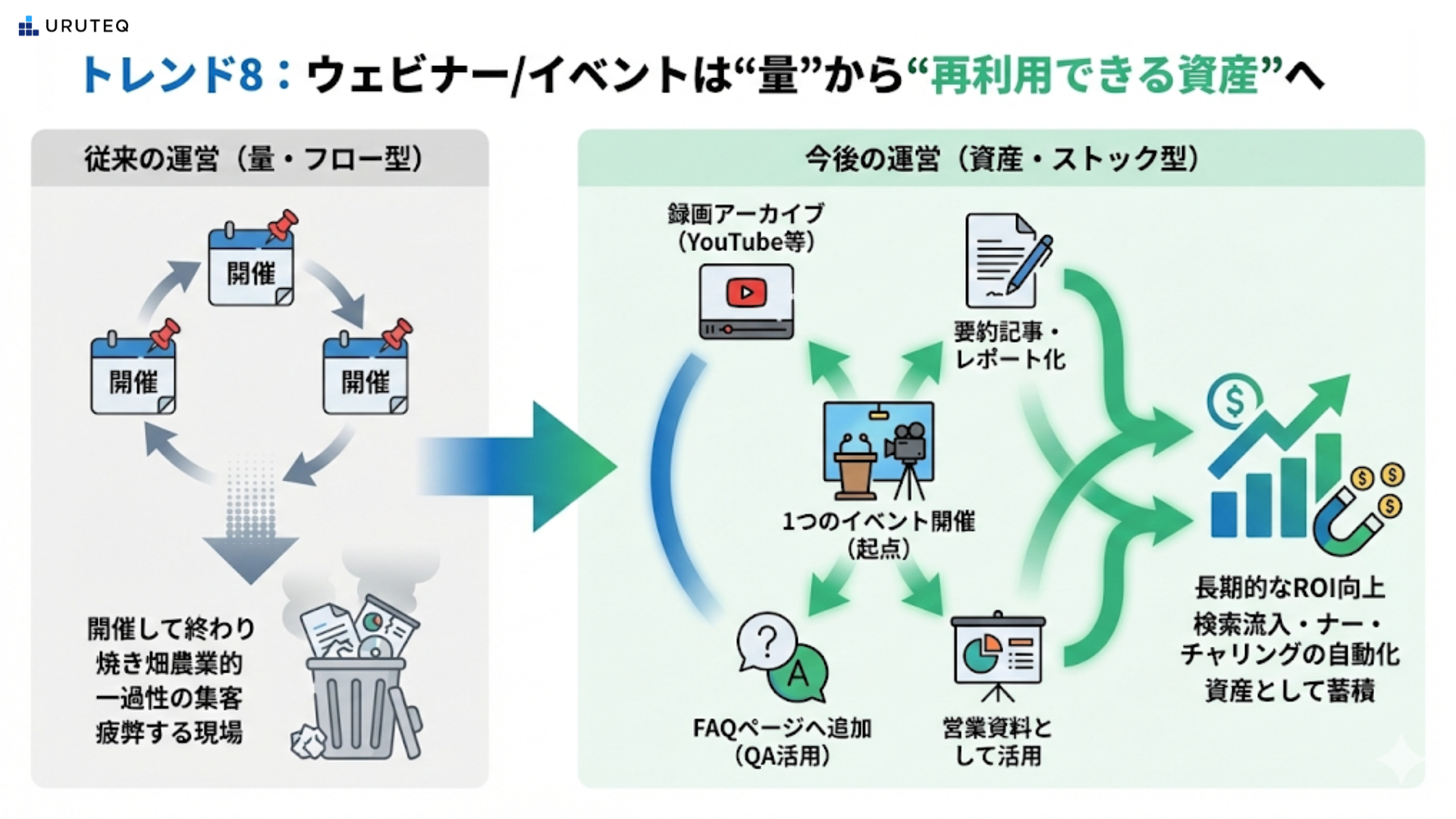 コロナ禍を経て定着したウェビナーですが、「開催して終わり」という焼き畑農業的な運用は見直されます。一度開催したイベントを、いかに骨までしゃぶり尽くすか、つまり「資産化」できるかが鍵になります。