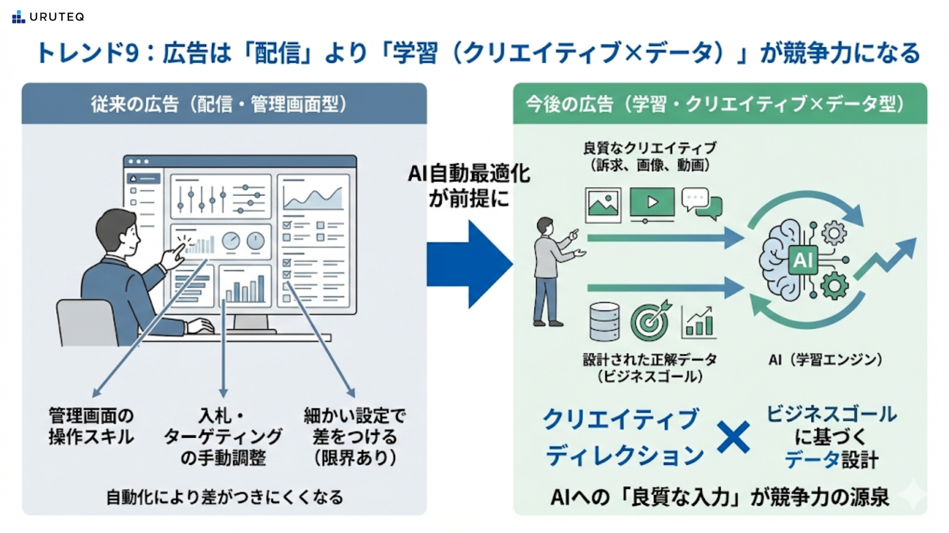 どのような訴求(コピー、画像、動画)をAIに入力するか、その質が成果を左右します。また、AIに学習させるためのデータ(どのコンバージョンを正解とするか)の設計も重要になります。