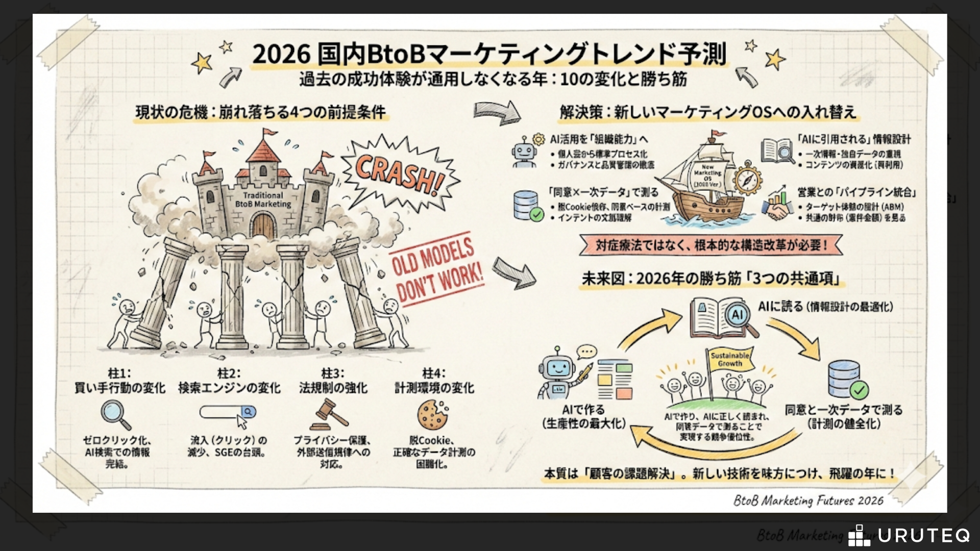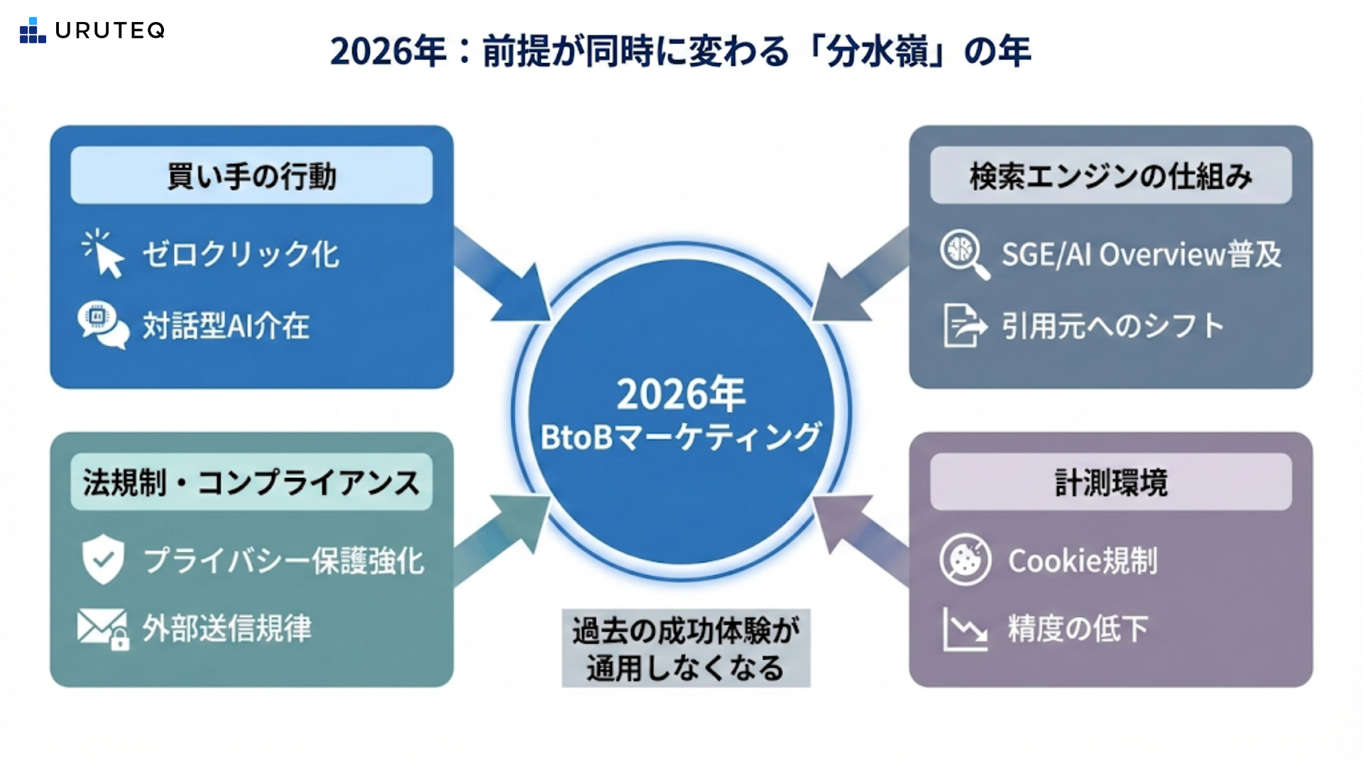 なぜ2026年が分水嶺になるのでしょうか。それは、買い手の行動、検索エンジンの仕組み、法規制、そして計測環境という、マーケティングを支える4つの柱が同時に変化を迎えるからです。