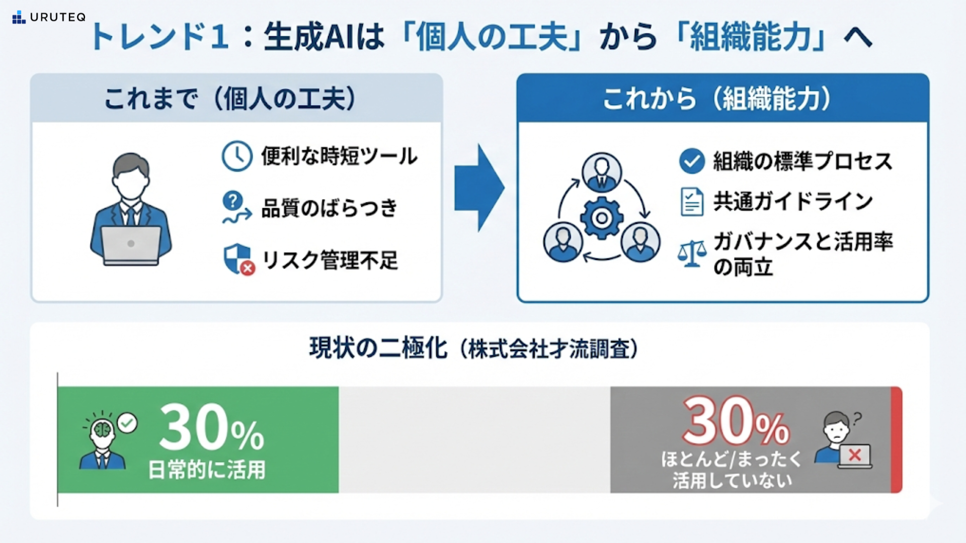 企画、制作、分析、運用のあらゆるフェーズにAIが組み込まれます。ただし、個人が勝手に使うのではなく、会社として認可された環境で、共通のプロンプト資産やガイドラインに基づいて運用されるようになります。個人任せの活用は、品質のばらつきやコンプライアンスリスク(著作権侵害や機密情報の流出)に直結するため、企業は「ガバナンス」を効かせながら「活用率」を上げるという難しい舵取りを迫られます。
