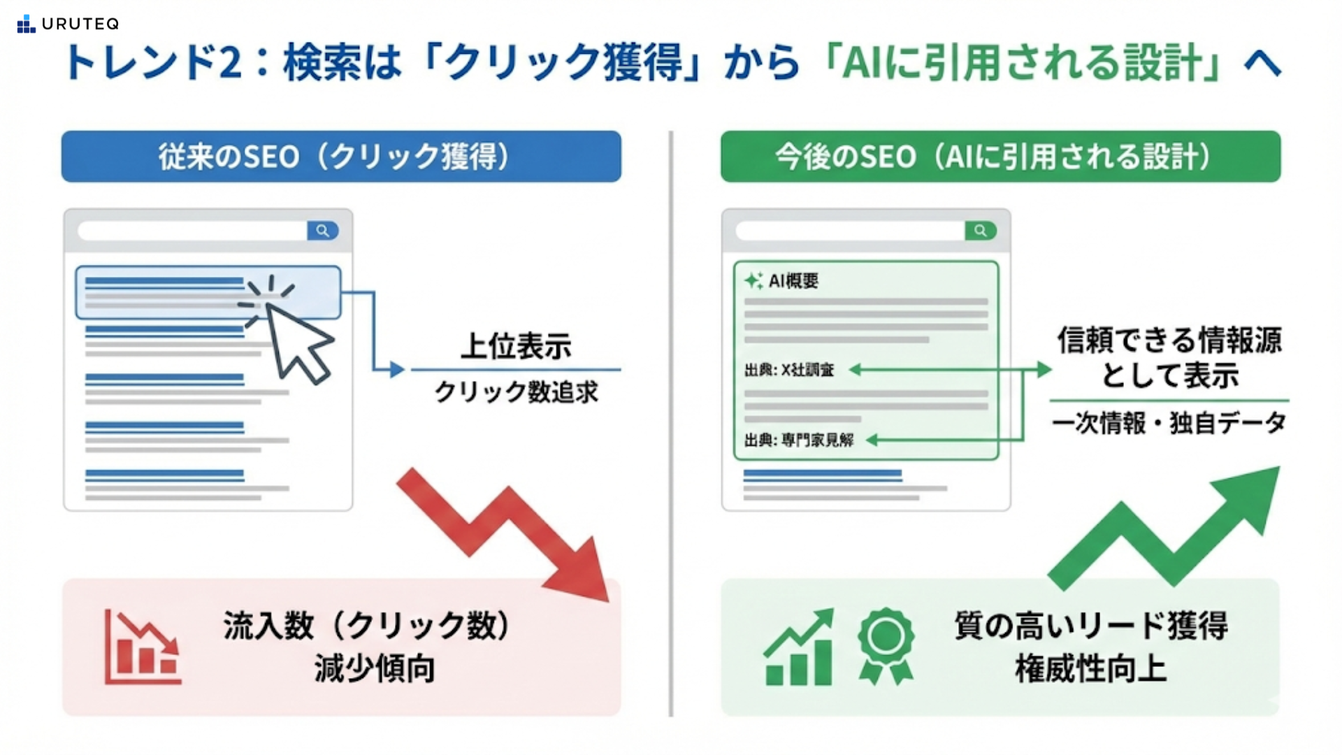GoogleのSGE(Search Generative Experience)やAI Overviewの普及により、ユーザーは検索結果画面上で疑問を解決できるようになります。結果として、Webサイトへの流入数(クリック数)は減少傾向となります。これに対抗するためには、AIが回答を作成する際に「信頼できる情報源」として参照したくなるような、一次情報や明確な定義、独自のデータをコンテンツに含める必要があります。