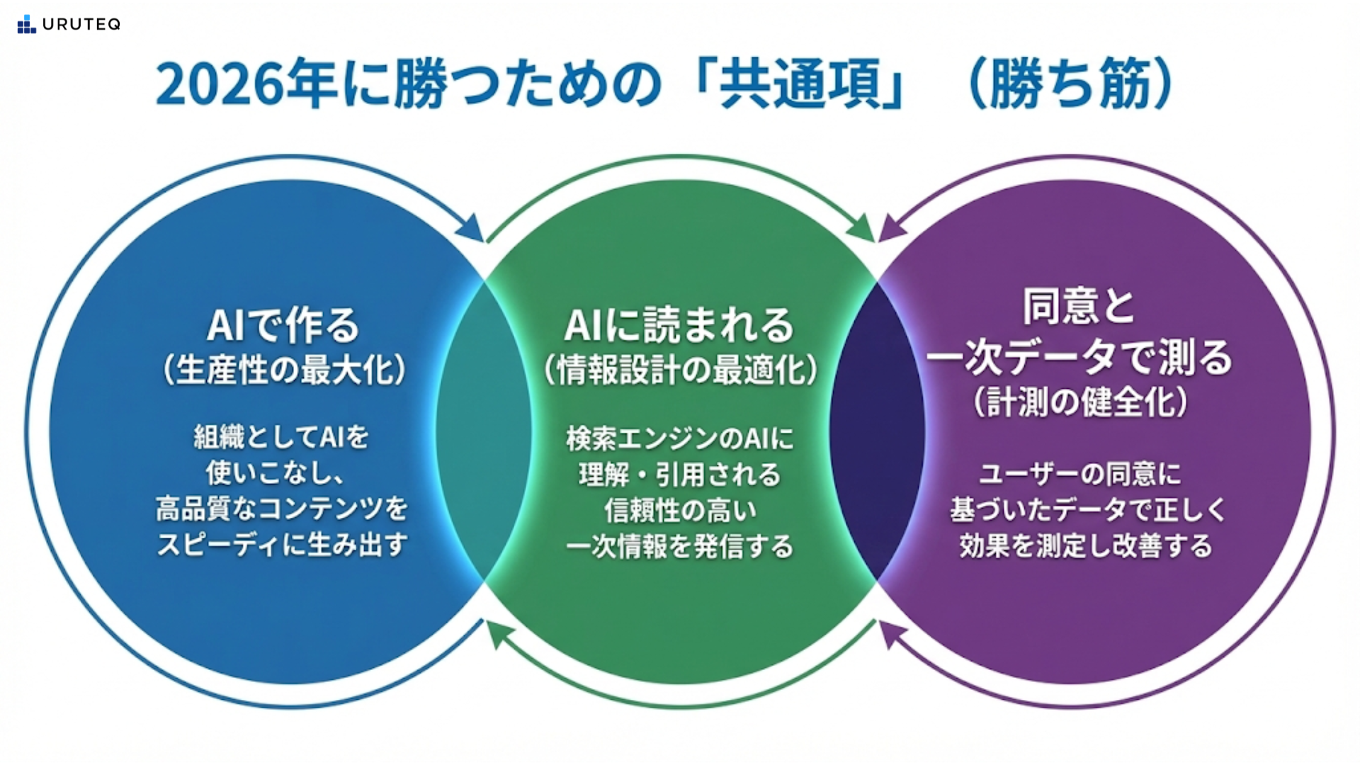 これら10のトレンドを俯瞰すると、2026年の国内BtoBマーケティングにおける「勝ち筋」の共通項が見えてきます。それは、以下の3点を同時に満たす組織になることです。