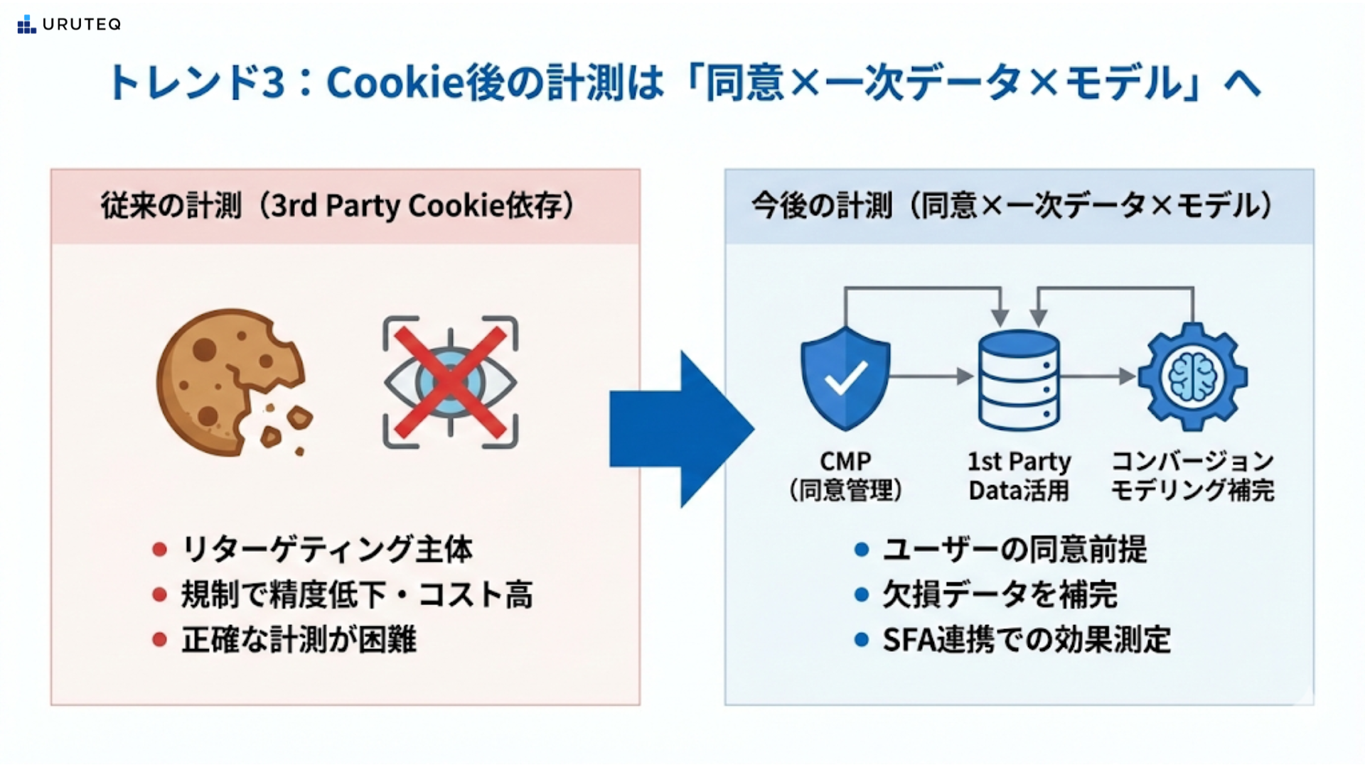 Web広告の効果測定において、3rd Party Cookieへの依存は限界を迎えます。これに代わり、ユーザーの同意(Consent)に基づいた1st Party Data(自社保有データ)の活用と、欠損したデータを補完するコンバージョンモデリングが主流になります。