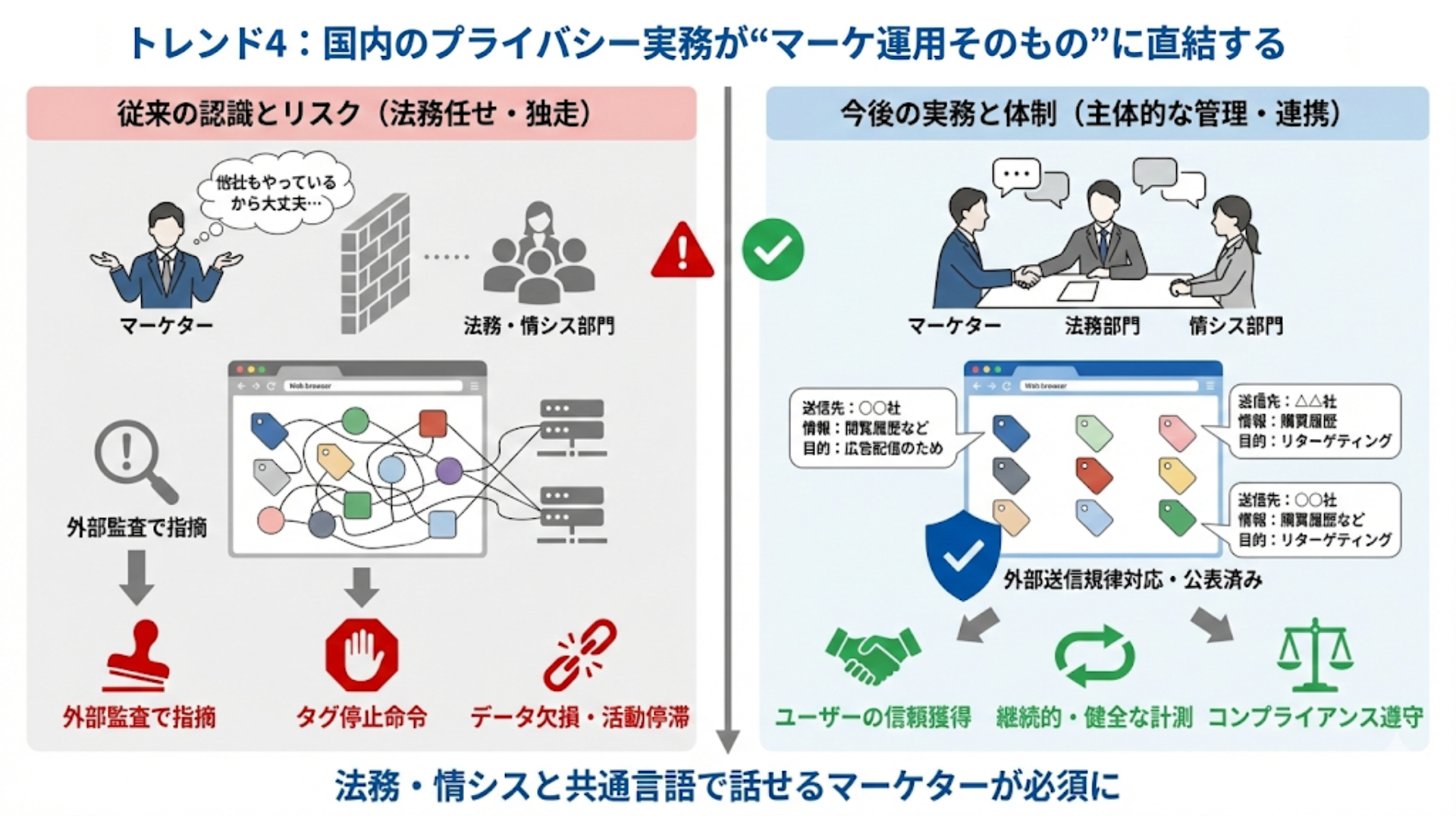 ここで少し、ある企業の失敗談をご紹介しましょう。 あるSaaS企業のマーケティングチームは、最新の分析ツールや広告タグを次々とWebサイトに導入していました。成果を急ぐあまり、法務部門への確認を後回しにし、「他社もやっているから大丈夫」と判断していたのです。しかし、改正法の施行に合わせて外部からの監査が入った際、無数の不明なタグが検出され、その説明責任を果たせない事態に陥りました。結果として、すべてのタグを一度停止せざるを得なくなり、数ヶ月にわたって計測データが欠損、マーケティング活動が停滞するという手痛いダメージを負いました。 2026年は、こうした「コンプライアンス無視の独走」が命取りになります。法務や情シスと共通言語で話せるマーケターの価値が高まるでしょう。