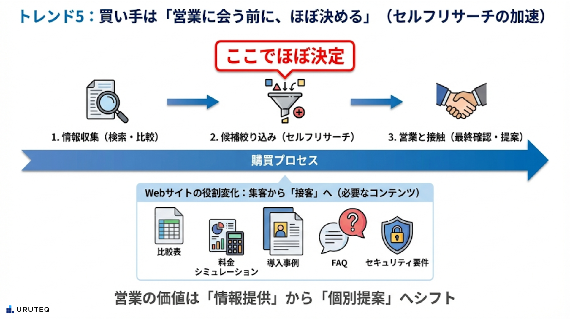 BtoBの購買行動における「セルフリサーチ(自己解決)」の傾向は、不可逆的な流れです。買い手は、営業担当者の売り込みを聞く前に、自分たちで情報を集め、比較し、候補を絞り込んでいます。