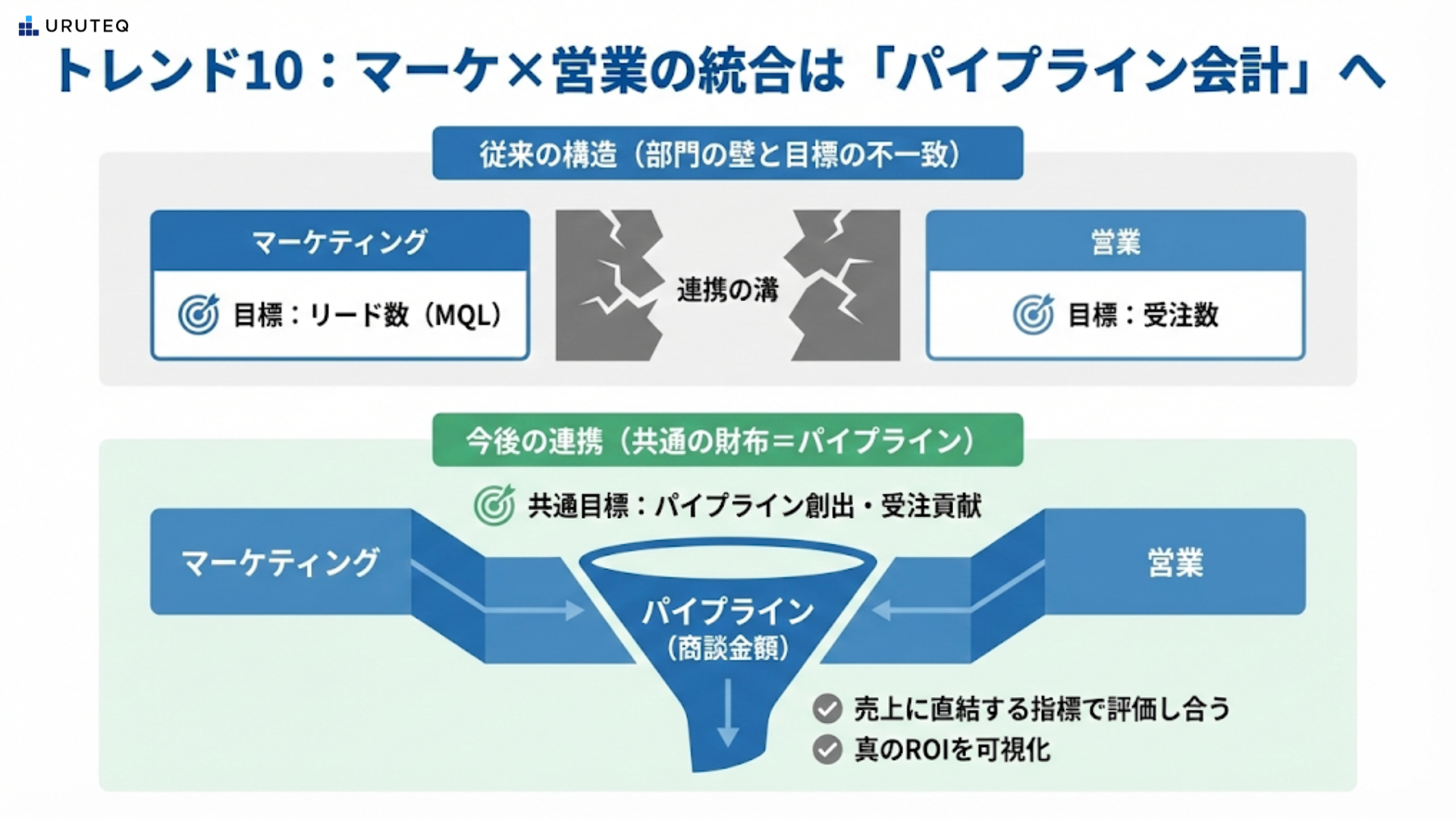 アトリビューション(成果への貢献度)分析の議論が再燃し、CRMやMAのダッシュボードも、リード数管理からパイプライン管理へと再設計されるでしょう。部門の壁を超えてデータを統合し、真のROIを可視化することが、2026年のマーケティング責任者の最重要ミッションとなります。
