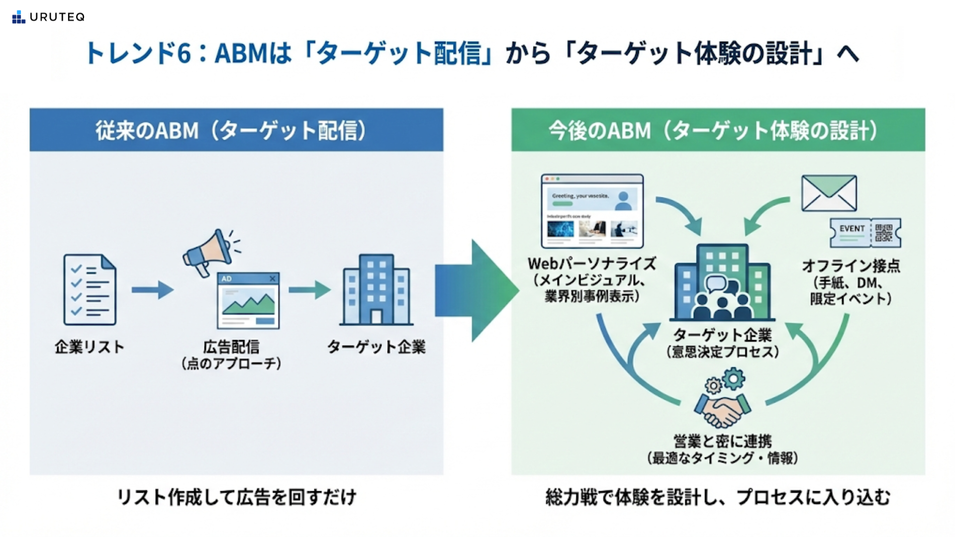ABM(アカウントベースドマーケティング)は、単に特定の企業に広告を出すだけの手法から脱却します。ターゲット企業の意思決定プロセス全体に入り込み、最適なタイミングで最適な情報を届ける「体験設計」へと進化します。