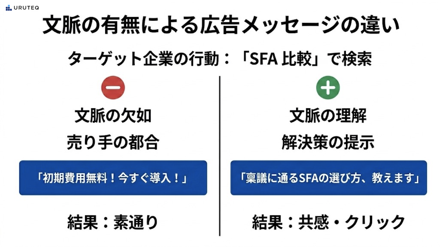 この失敗の背景には、ターゲットが置かれている状況への想像力の欠如があります。「SFA 比較」と検索しているからといって、すぐにシステムを買い替えたいとは限りません。もしかすると、上司から「最近よく聞くSFAってうちにも必要なのか調べておいて」と軽い指示を受けただけの若手社員かもしれませんし、現在のシステムに不満があり、乗り換えの稟議書を書くための材料を探しているマネージャーかもしれません。