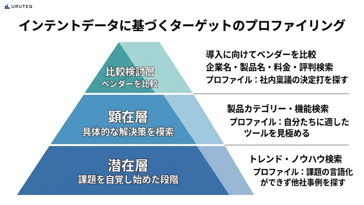 もっとも購買に近いのが比較検討層です。インテントデータ上でも、具体的な企業名、製品名、「○○ 料金」「○○ 評判」「○○ デメリット」といった非常に直接的なキーワードでの行動が観測されます。