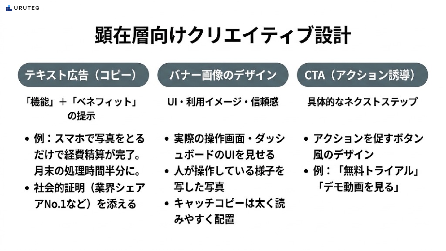 ターゲットの状況を3つの段階に整理できたら、次はいよいよクリエイティブの作成です。段階ごとに、バナーとテキストのメッセージは大きく変わります。