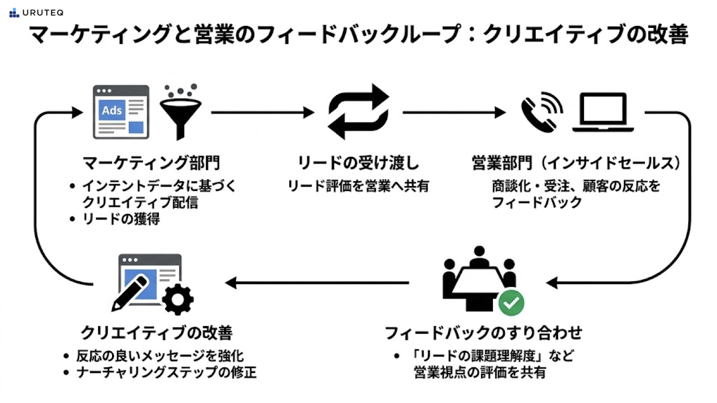 ここで重要になるのが、インサイドセールスやフィールドセールスといった営業部門との連携です。マーケティング部門がインテントデータをもとにクリエイティブを工夫して獲得したリードが、営業現場でどう評価されたのかを定期的にすり合わせます。