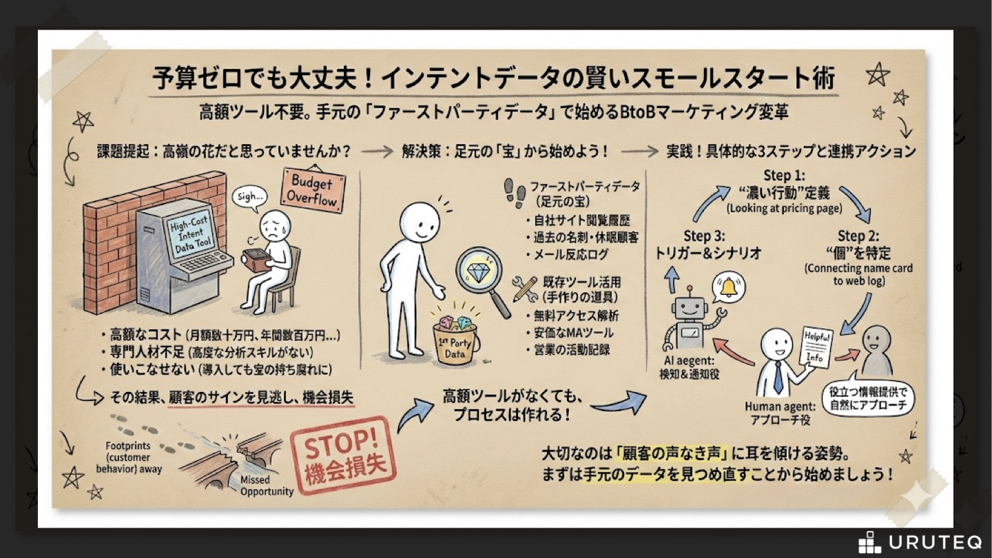 目の前にある情報をどう解釈し、どう動くか。予算がないならないなりの、賢い戦い方があります。自社のリソースを見つめ直し、小さく、しかし確実に成果を生み出すためのインテントデータ活用法を探っていきます。