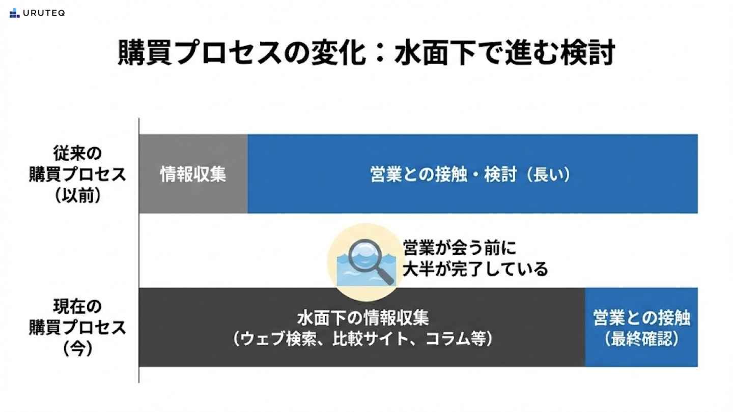 BtoB商材の購買プロセスにおいて、買い手は営業担当者に会う前に、すでに情報収集の大半を自力で終えていると言われています。検索エンジンで課題の解決策を探し、関連するウェブサイトのコラムを読み、比較サイトで製品のスペックを見比べる。こうした行動が水面下でひそかに行われています。