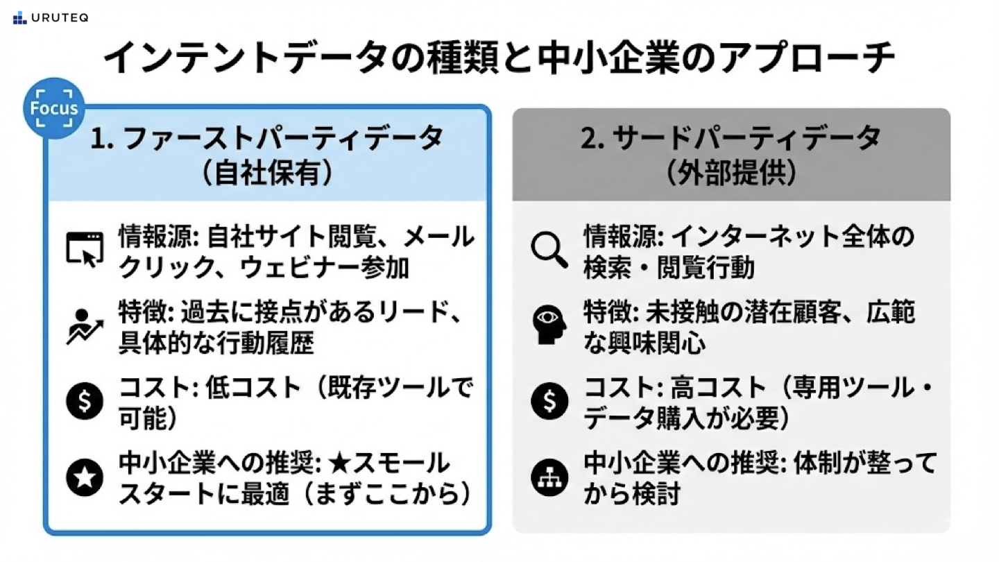 もう一つは、外部のデータベンダーなどが提供する「サードパーティ・インテントデータ」です。これは、自社のウェブサイトの外、つまりインターネット全体で特定の企業がどのようなキーワードを検索しているか、競合他社の情報を調べていないかといった、より広範な行動履歴を指します。