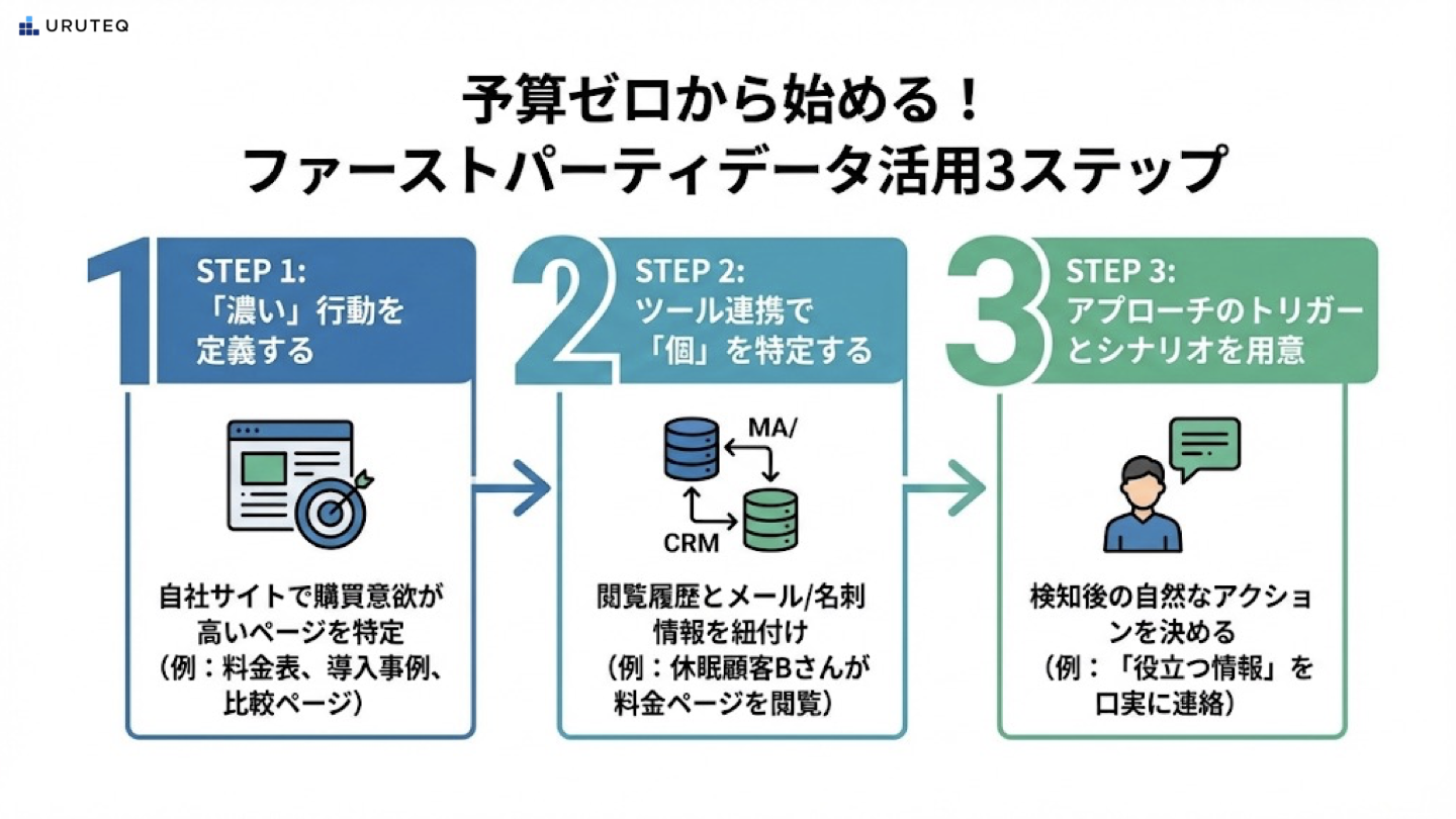 では、具体的にどのようにして手元のデータからインテントを読み解けばよいのでしょうか。高額な投資を行わずに、明日からでも始められる三つのステップを紹介します。