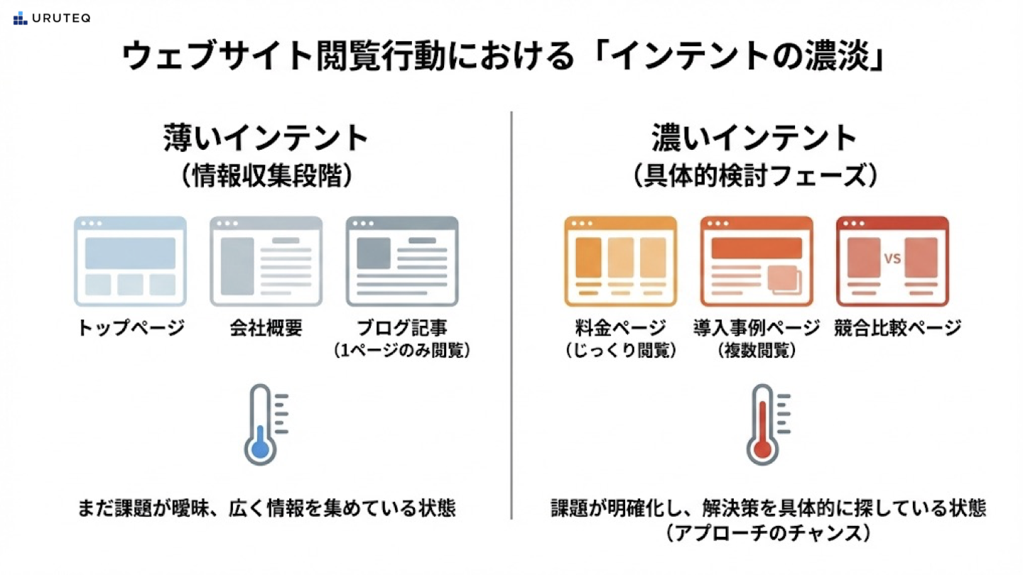 トップページや会社概要、あるいはブログのコラム記事を1ページだけ見て離脱した人は、まだ単なる情報収集の段階かもしれません。一方で、料金表のページをじっくり見ている人、導入事例のページを複数閲覧している人、あるいは競合製品との比較ページを読んでいる人は、明らかに具体的な検討フェーズに入っていると推測できます。