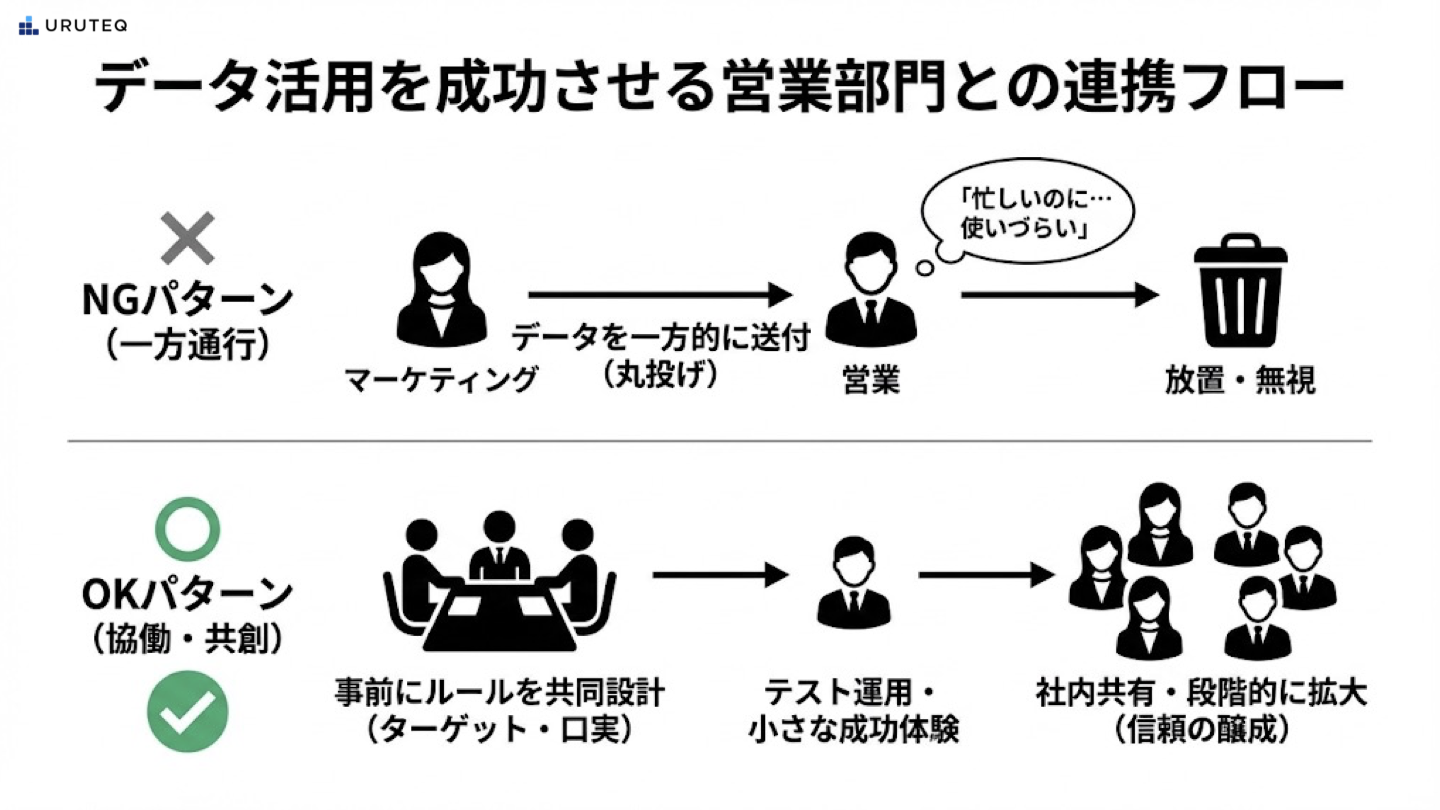 これを防ぐためには、マーケティング部門が一方的にデータを送りつけるのではなく、事前に営業のエース級担当者を巻き込んでルールを作ることが不可欠です。