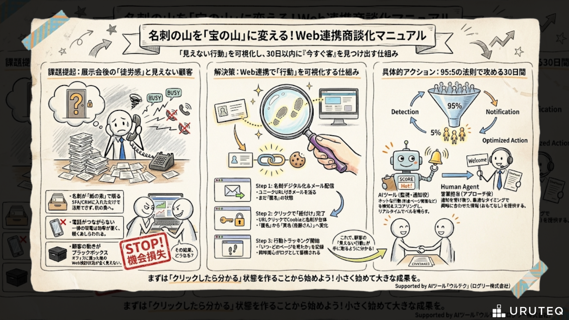 まずは自社で利用しているメール配信システムや顧客管理ツールに、Webトラッキング機能やクリック通知機能がないか確認することから始めてみてください。小さく始める一歩が、展示会成果の大きな飛躍につながります。