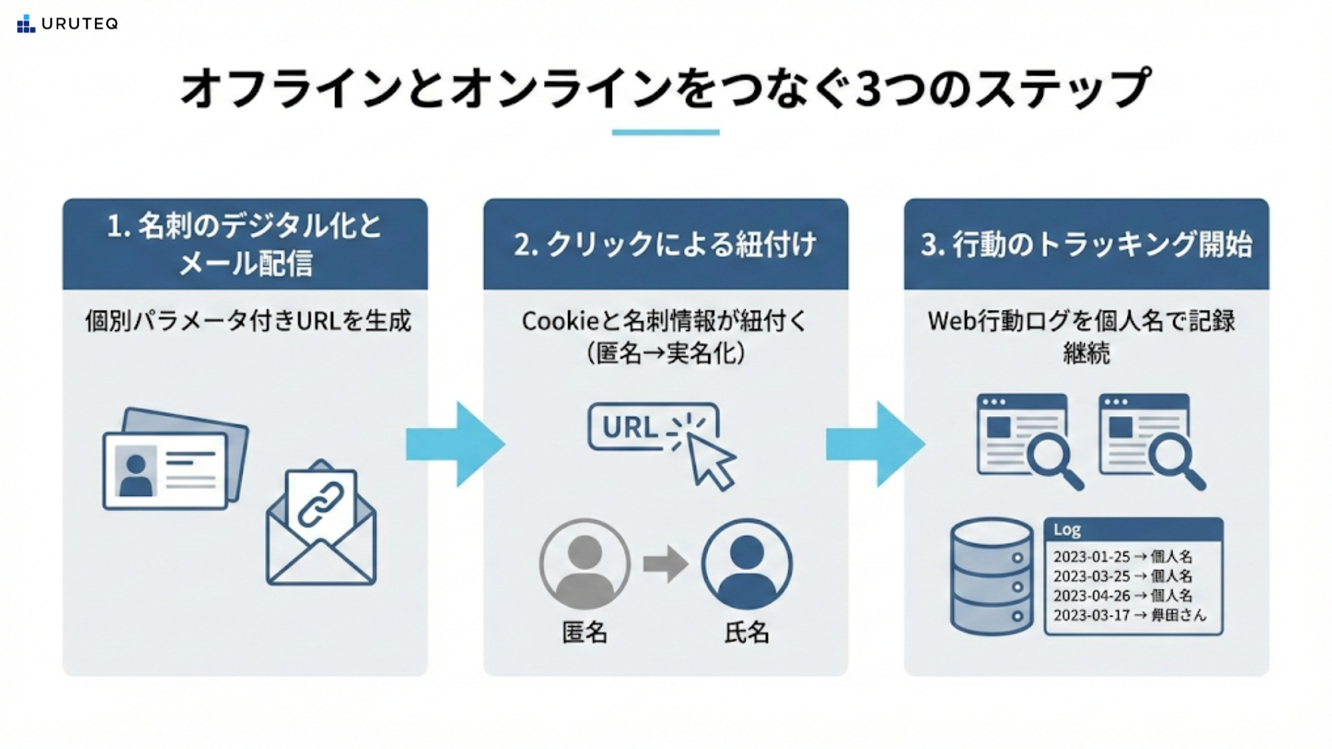 まず最初に、「名刺交換しただけの相手が、自社サイトを見ているかどうかなぜ分かるのか?」という疑問を解消しておきましょう。ここがブラックボックスのままだと、施策への信頼感が持てず、チーム内での共有も難しくなります。
