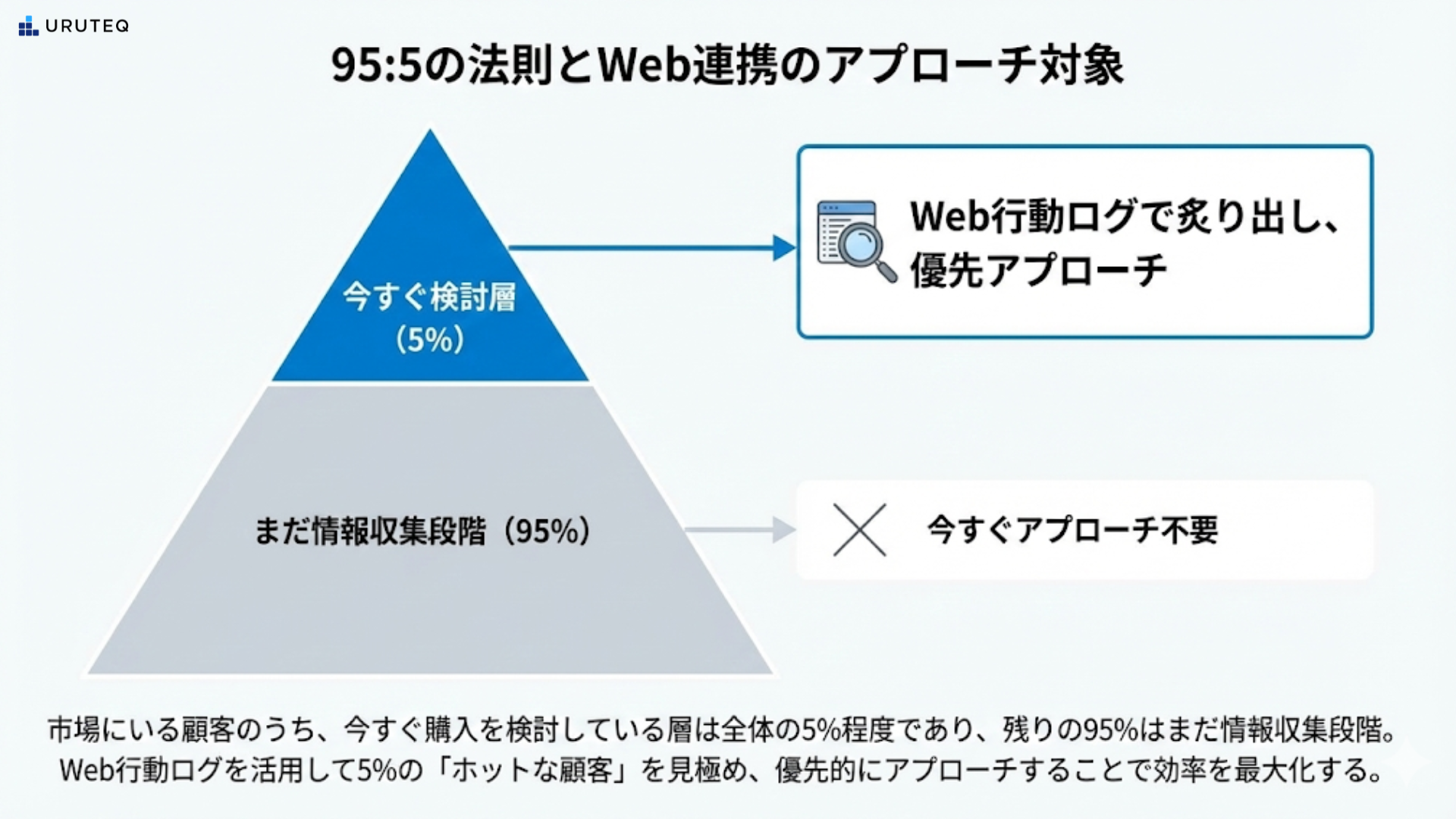 BtoBマーケティングの世界では、一般的に「95:5の法則」があると言われています。市場にいる顧客のうち、今すぐ購入を検討している層は全体のわずか5%程度であり、残りの95%はまだ情報収集段階か、そもそも課題を認識していない段階だという説です。