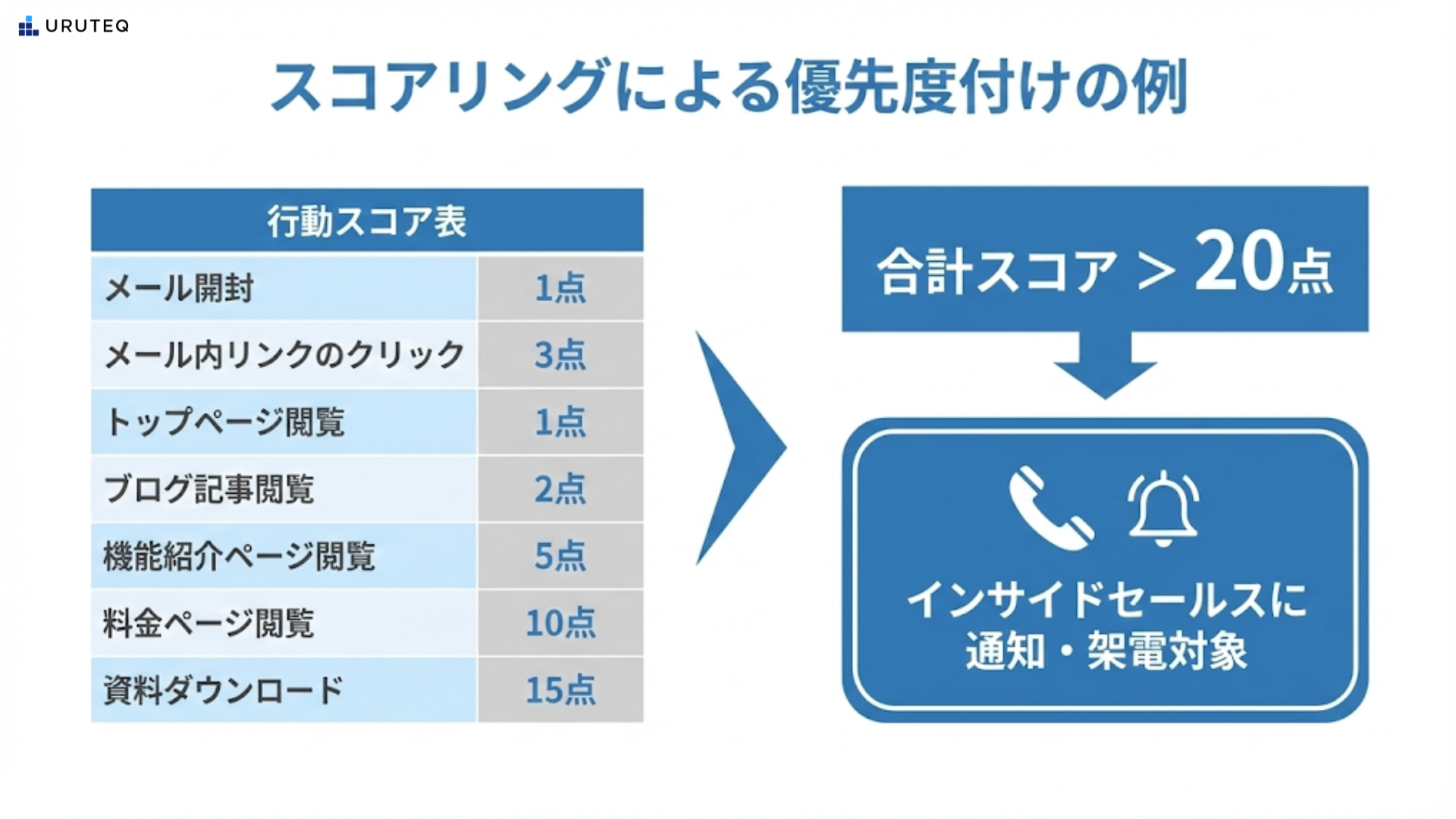 そして、「合計スコアが20点を超えたらインサイドセールスに通知し、架電対象とする」といった閾値を設けます。これにより、「なんとなく良さそう」という曖昧な判断ではなく、客観的な行動データに基づいたアプローチが可能になります。