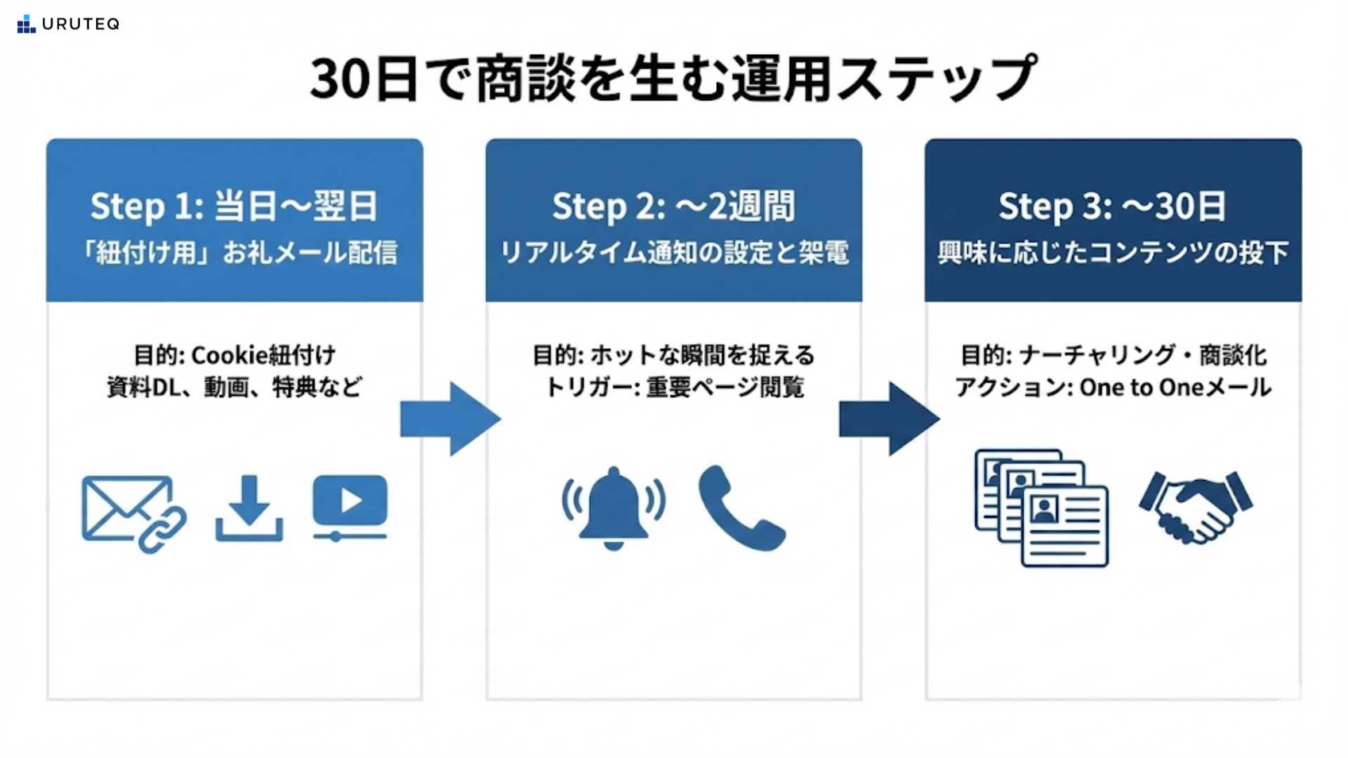優先度付けのロジックが決まったら、あとは実行フェーズです。展示会が終わってからの30日間は、顧客の記憶が残っている勝負の期間です。ここでは、具体的な運用モデルを3つのステップで紹介します。