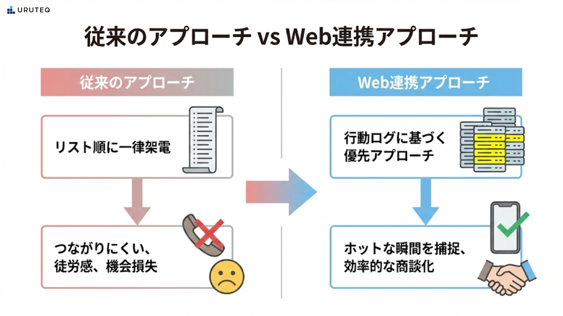 リソースが限られている現場こそ、この優先度付けが命綱になります。電話がつながらない95%に時間を費やすのをやめ、反応がある5%にリソースを集中させる。これがWeb連携の本質的な価値です。