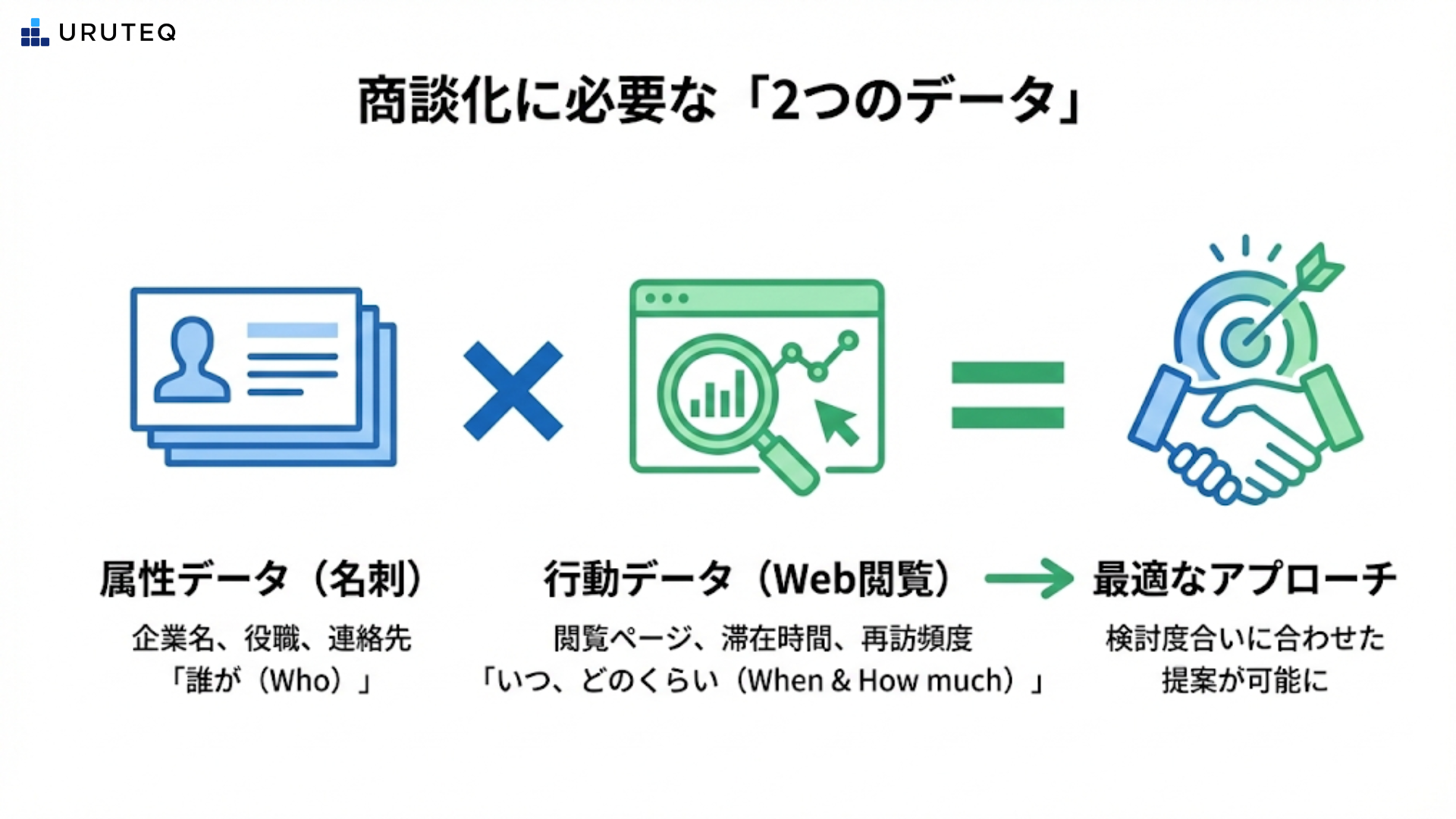 これにより、それまでは「匿名の誰か」だったアクセスログが、「◯◯株式会社の佐藤さん(仮)」という個人の行動として認識されるようになります。「名刺交換した佐藤さん」=「ユーザーID:12345」というリンクが確立されるイメージです。