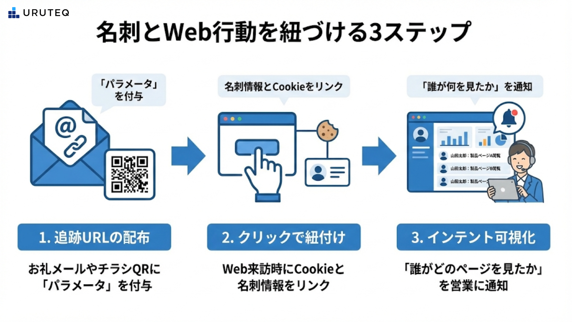 では、具体的にどのようにして紙の名刺とデジタルのWeb行動を紐づけるのでしょうか。「高度なITスキルが必要なのでは?」「高価なツールがないと無理なのでは?」と身構える必要はありません。基本的な仕組みはシンプルで、以下の3ステップで構成されています。