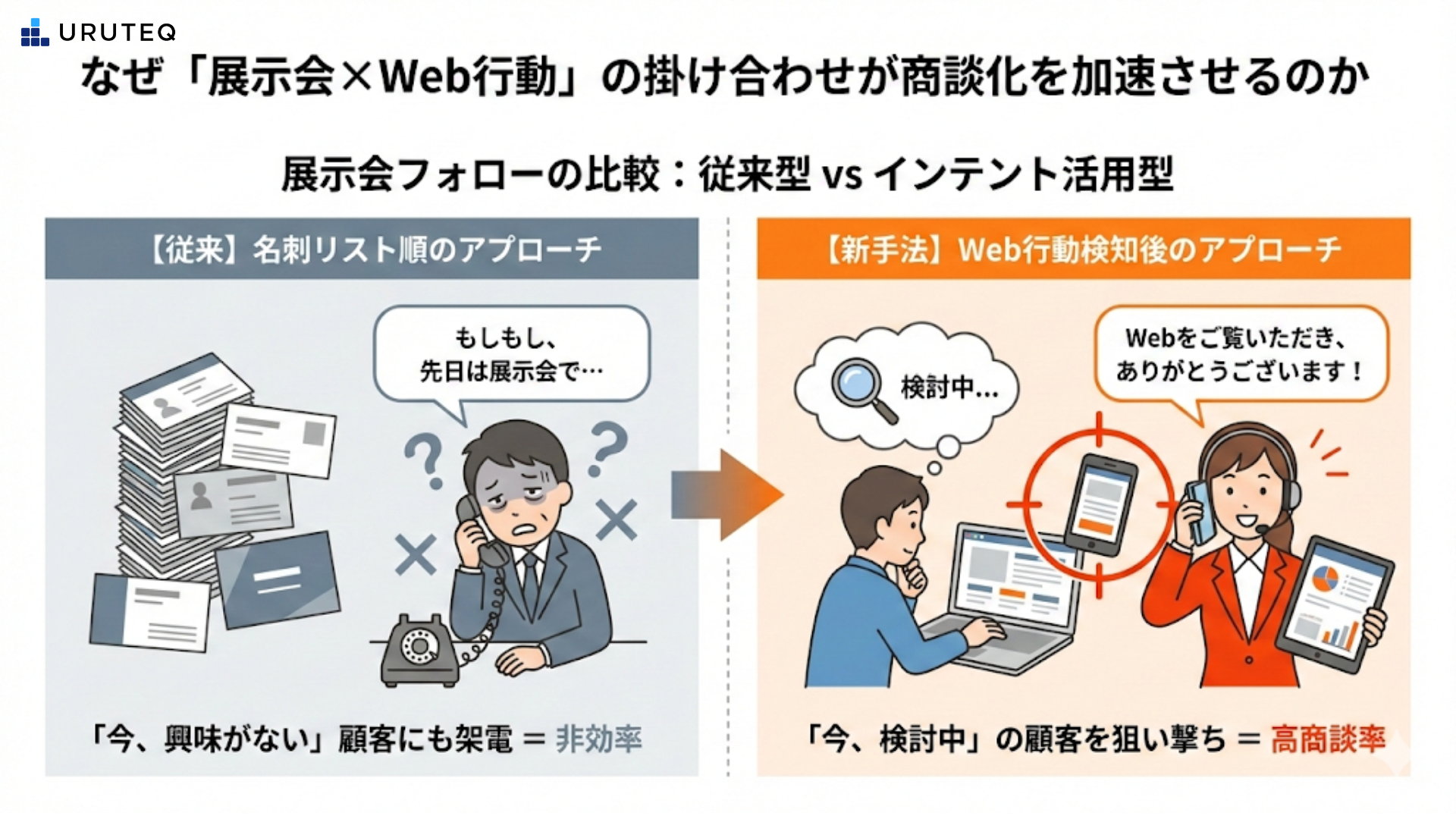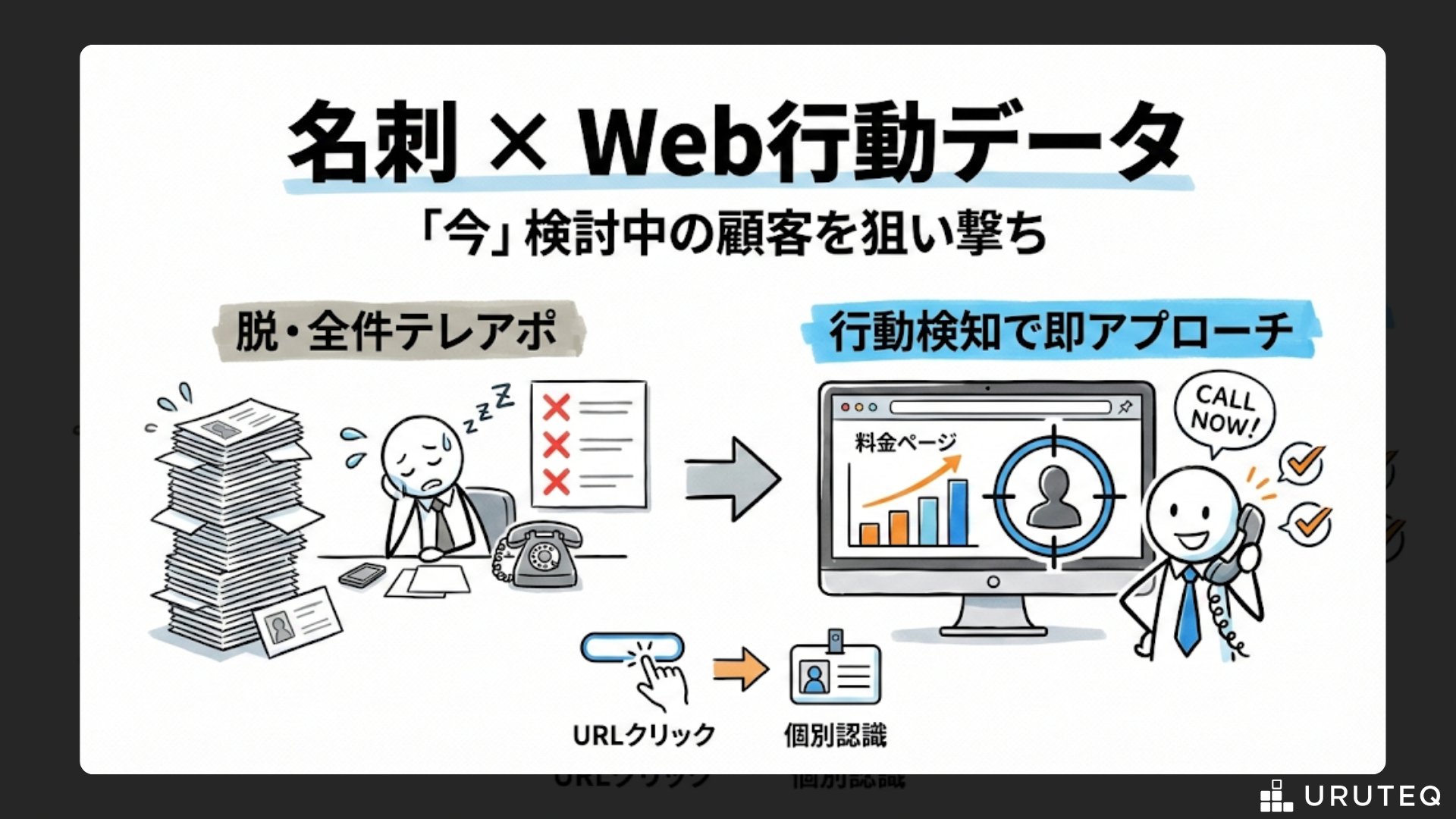 展示会で大量に集めた名刺、上から順に電話をかけて疲弊していませんか?本記事では、アナログな名刺情報とデジタルのWeb行動履歴を紐づけることで、「今まさに検討している」見込み顧客を特定し、最適なタイミングでアプローチするための具体的な手法を解説します。効率と成約率を劇的に変える、新しいフォローアップの常識をお伝えします。