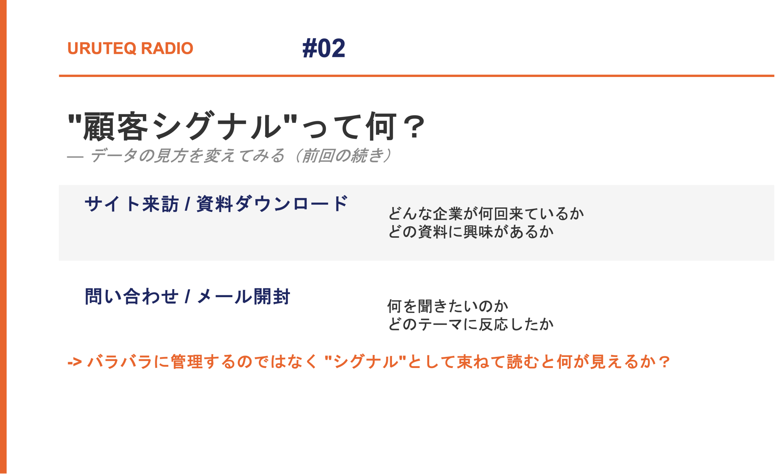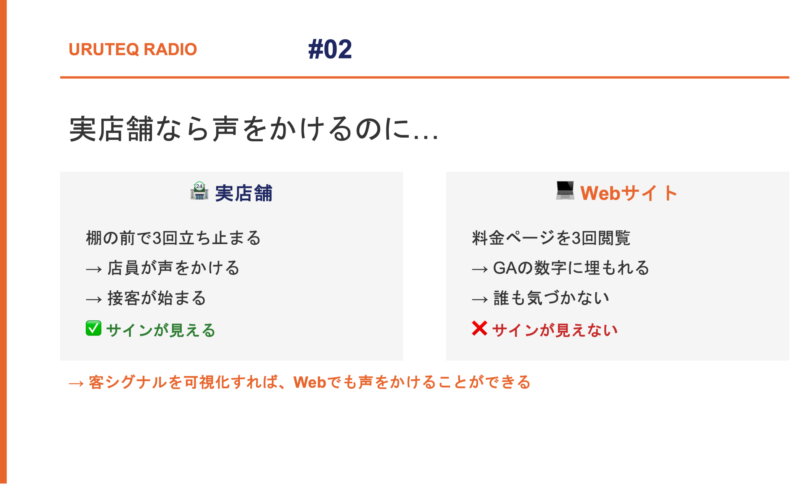 齊藤: ウルテクラジオ第2回、始めていきたいと思います。前回のポイントとして「データを見ているだけではアクションに繋がらない」というお話をしました。今回は前回話しきれなかった「顧客シグナルとは何か」について深掘りしていきます。実店舗などのオフラインと、Webの世界を比べてみると分かりやすいですよね。