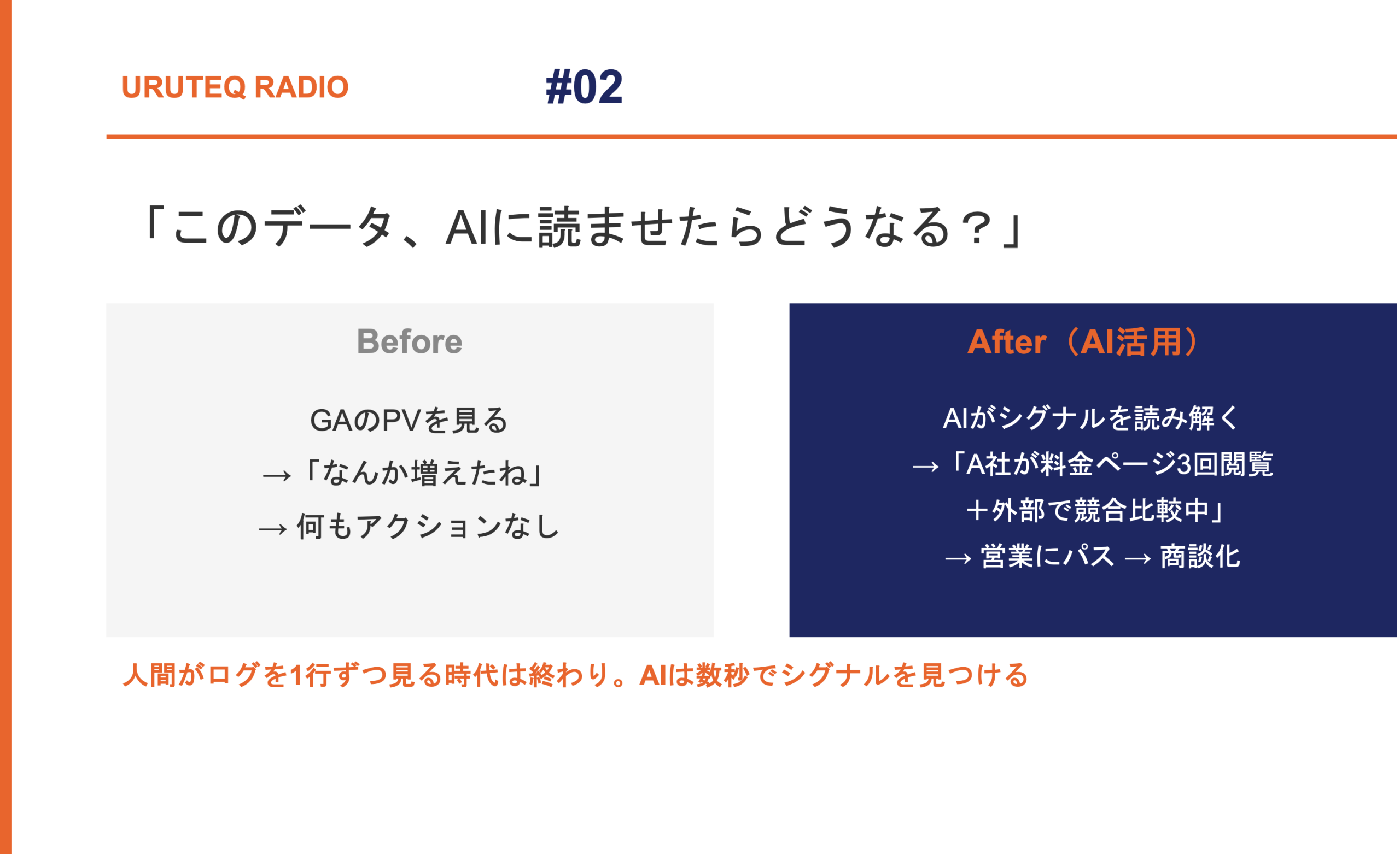 齊藤: それは大きな変化ですね。単純に「PVが多いから良いページだ」とは限らないわけですね。「誰がそのページを見て、その前後にどんな行動をしているのか」という文脈を理解しないと、ビジネス的な価値は見えてきません。AIの登場によって、従来の「ただ数字を見るだけ」の状態から、サイト内外の情報を組み合わせて顧客シグナルの「見方を変える」ことができるようになったと言えます。