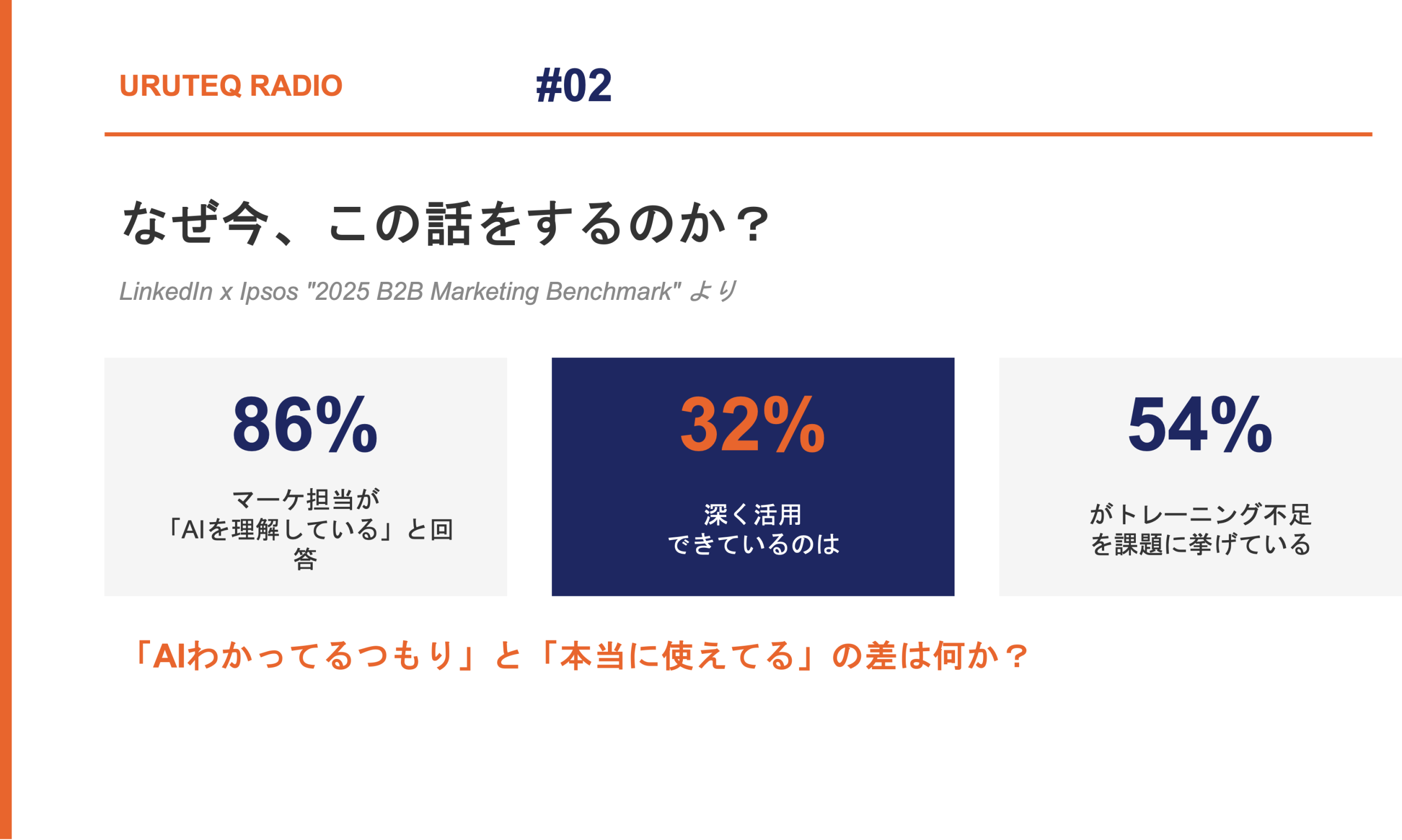 齊藤: B2Bマーケターに関する海外の調査記事によると、約9割が「AIを理解している」と回答している一方で、「深く活用できている」のはわずか32%にとどまっているそうです。この「理解しているつもり」と「実際に使えている」の差についてはどうお考えですか?