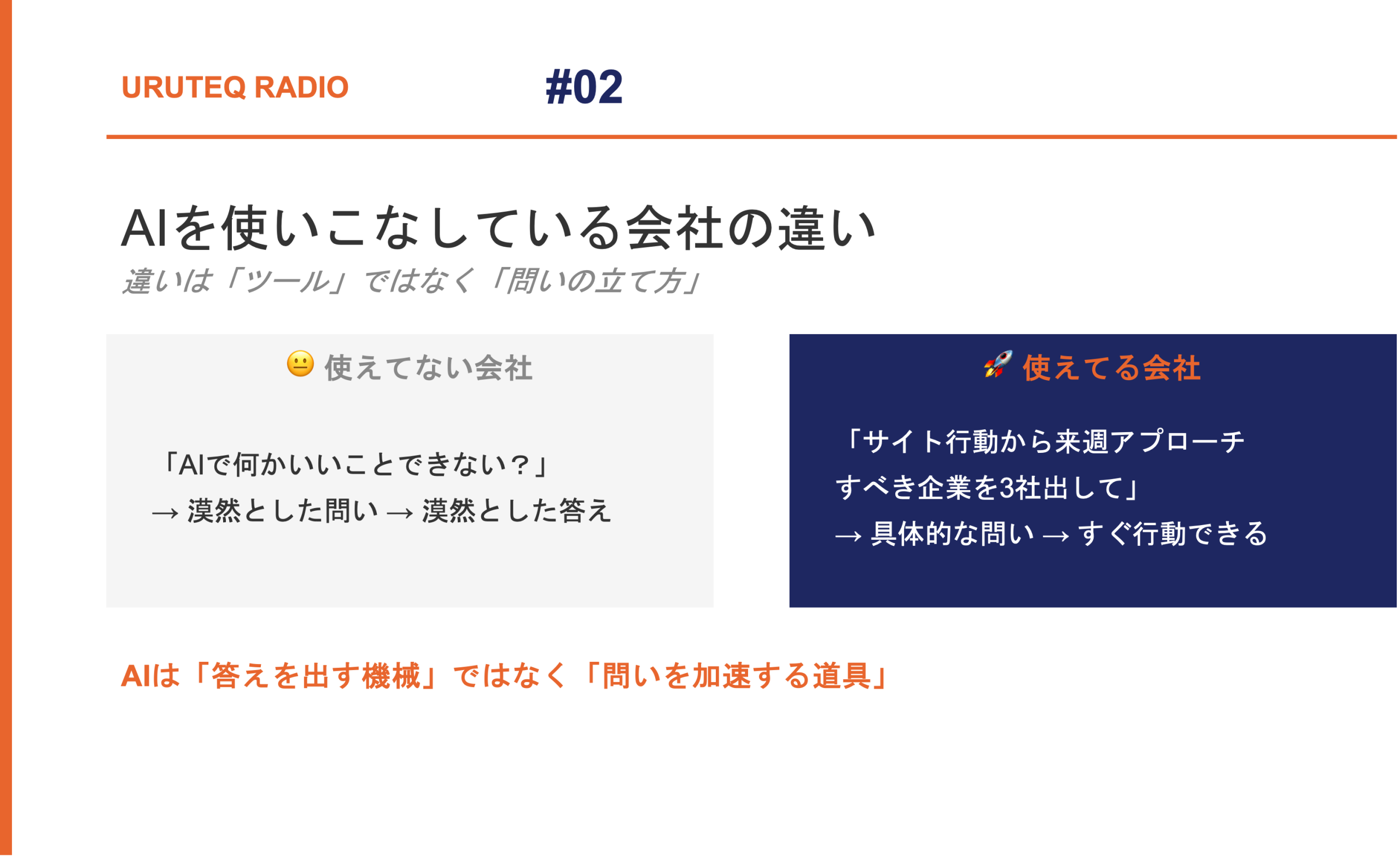 齊藤: 実際に業務の中で「AIを活用できている企業」と「そうでない企業」の差を考えると、活用しきれていない企業は、「AIで何かいいことできないかな?」といった漠然とした問いで止まってしまっていることが多いですよね。一方で、しっかり活用できている企業は、「サイト行動のデータから、来週アプローチすべき企業を3社出して」といったように、具体的なアクションに繋がる問いかけができているのではないでしょうか。