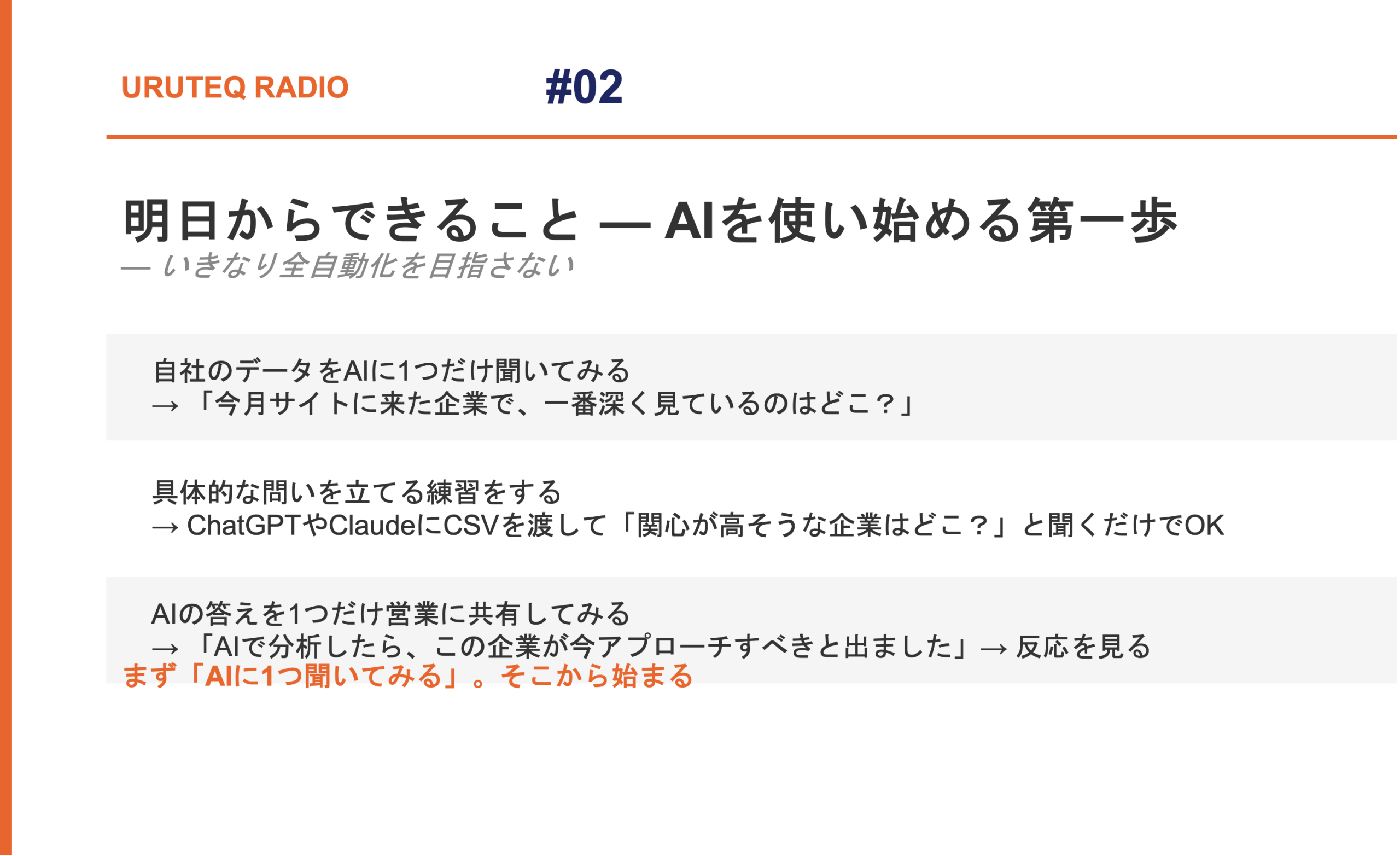 BtoBマーケティングや営業の現場で、「今まで通りの施策が効かなくなってきた」と感じることはありませんか? そんな現場のリアルな課題に向き合い、明日から使えるヒントを探る新企画「ウルテクラジオ」がスタートしました。ウルテク事業責任者の井上と、長きにわたりBtoBマーケティングに携わってきた齊藤の2人が、お互いの知見を交えながらラジオ感覚でお届けするライブトーク番組です。