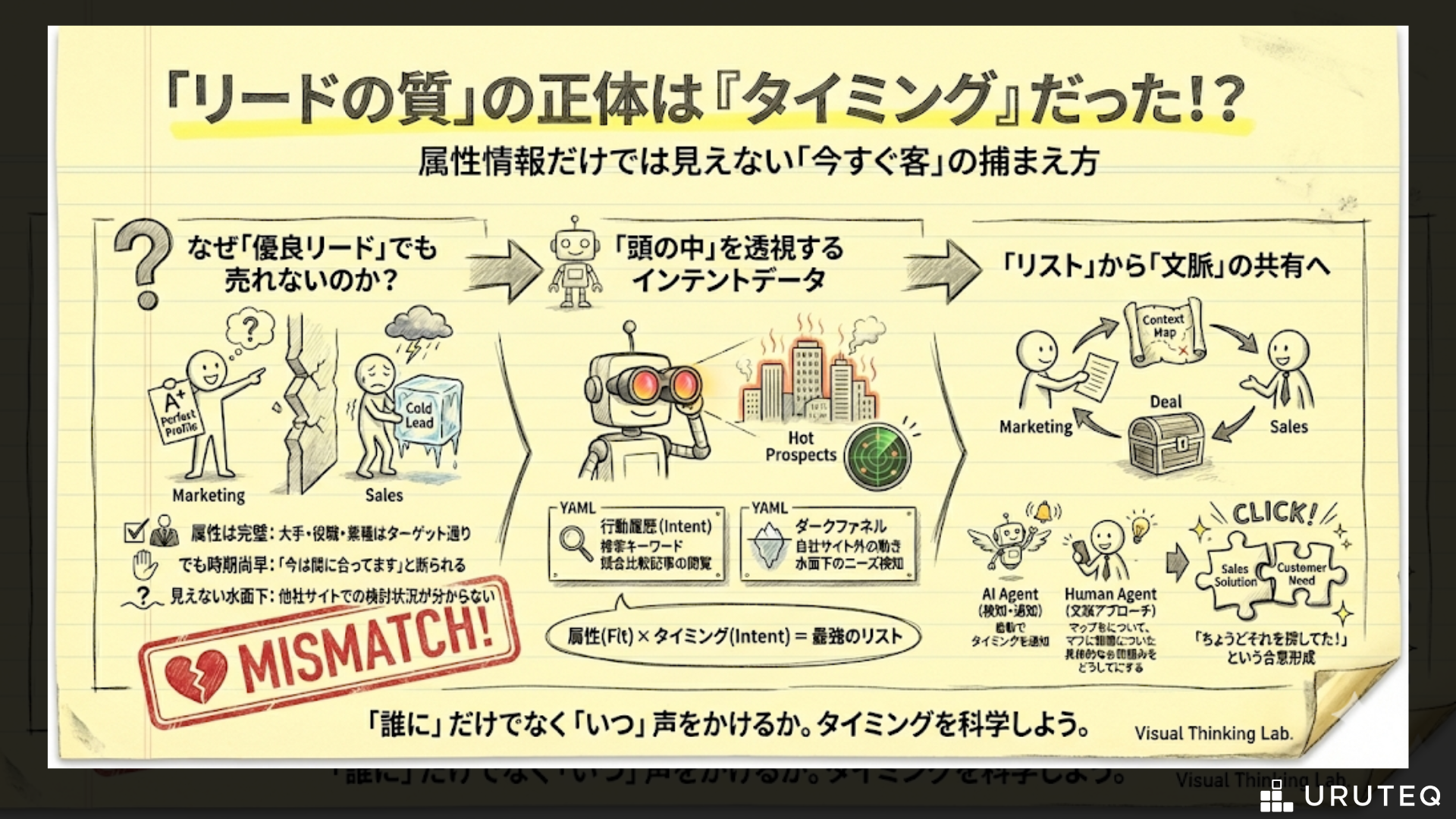 長年議論されてきた「リードの質」という課題。その多くは、顧客の属性の良し悪しではなく、アプローチする「タイミング」の不一致に起因しています。