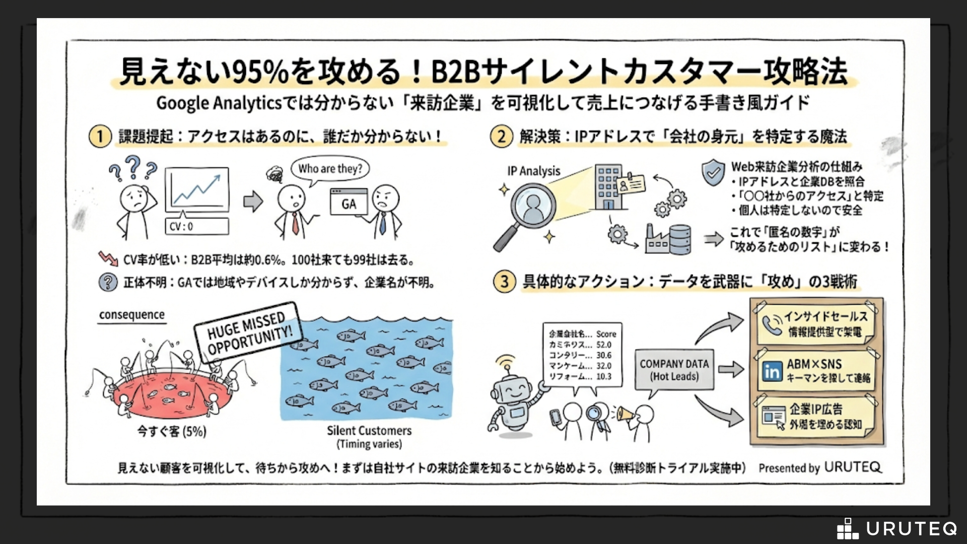 B2Bサイトの平均コンバージョン率はわずか0.6%と言われますが、離脱した99%以上のユーザーの中には、将来の有力顧客となる「サイレントカスタマー」が眠っています。本記事では、Google Analyticsでは見えない企業単位のアクセスを可視化する「Web来訪企業分析」の手法を解説。市場の95%を占める「今すぐ客ではない層」を捉える重要性と、特定したデータをインサイドセールスやABM、コンテンツ改善などの「攻め」のアクションに繋げる3つの具体戦術を紹介します。見えない顧客を可視化し、機会損失を防ぐための実践的なノウハウ集です。
