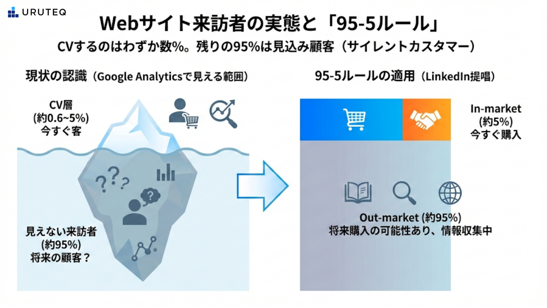 B2Bサイトのコンバージョン率が0.6パーセントだとしても、残りの99.4パーセントを諦める必要はありません。LinkedInの「95-5ルール」が示す通り、その多くは将来の顧客になり得る層であり、彼らを放置することは大きな機会損失に繋がります。