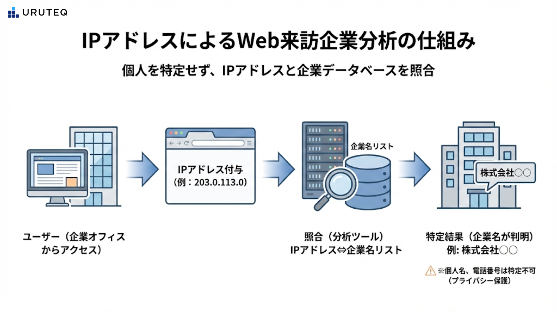 ここで一つ、明確にしておきたいことがあります。この技術で特定できるのはあくまで企業や組織という単位までであり、アクセスしている個人の氏名やメールアドレス、電話番号までは分かりません。つまり、プライバシーを侵害するような個人の特定を行っているわけではないのです。そのため、個人情報保護法やGDPRなどの規制の観点から見ても、適切に利用する限りにおいては安全なマーケティング手法として定着しています。