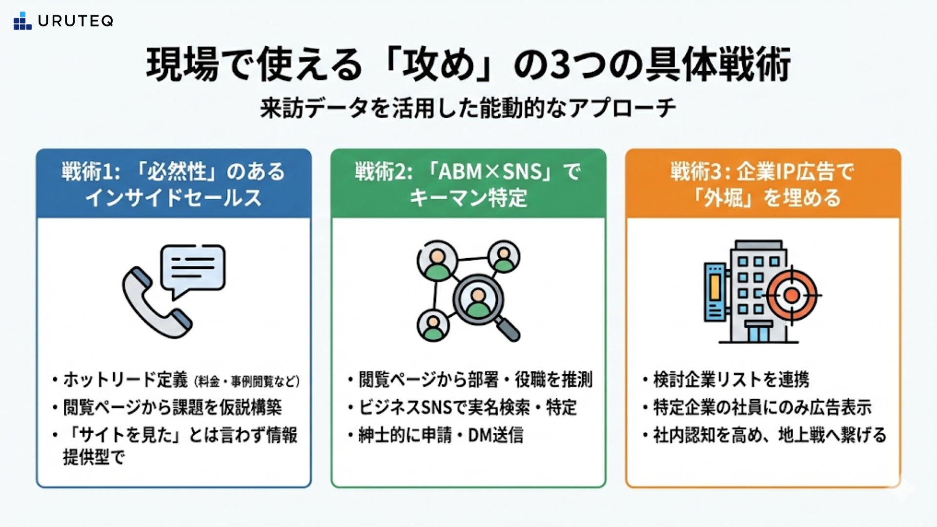 では、見えたデータをどのように営業成果に繋げればよいのでしょうか。いきなり「弊社のサイトを見ていましたよね?」と電話をかけてはいけません。それは相手を怖がらせるだけで、逆効果です。明日から営業チームが実践できる、3つの具体的な「攻め方」を解説します。
