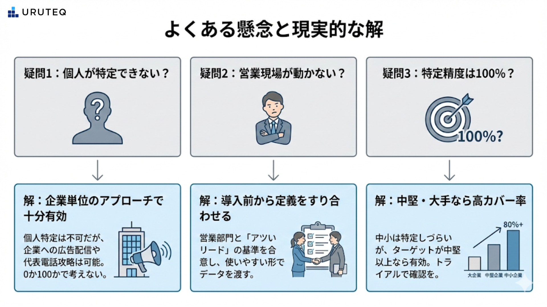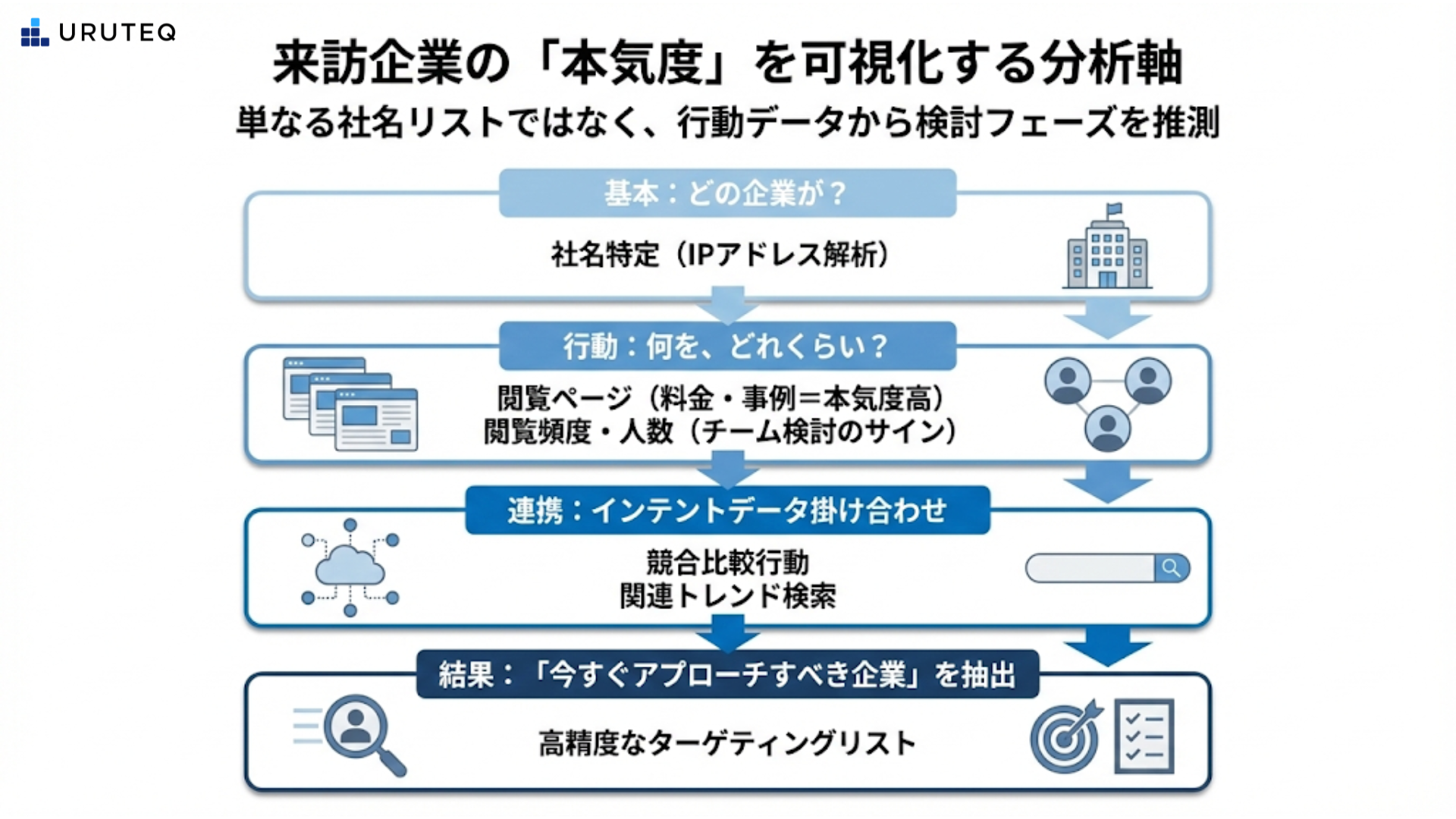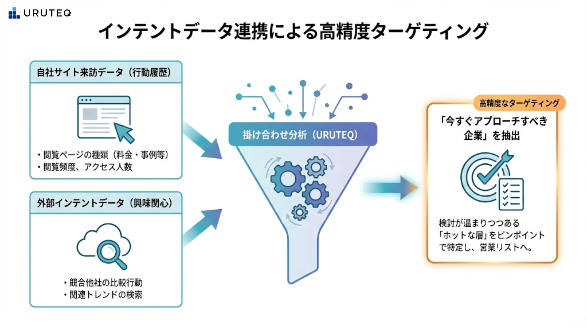 95パーセントのout-market層の中にも、限りなく5パーセントに近い「今まさに検討が温まりつつある層」が存在します。それを高精度でピックアップし、「今すぐアプローチすべき企業」として営業に提示する。それがURUTEQの提供する新しい営業体験です。